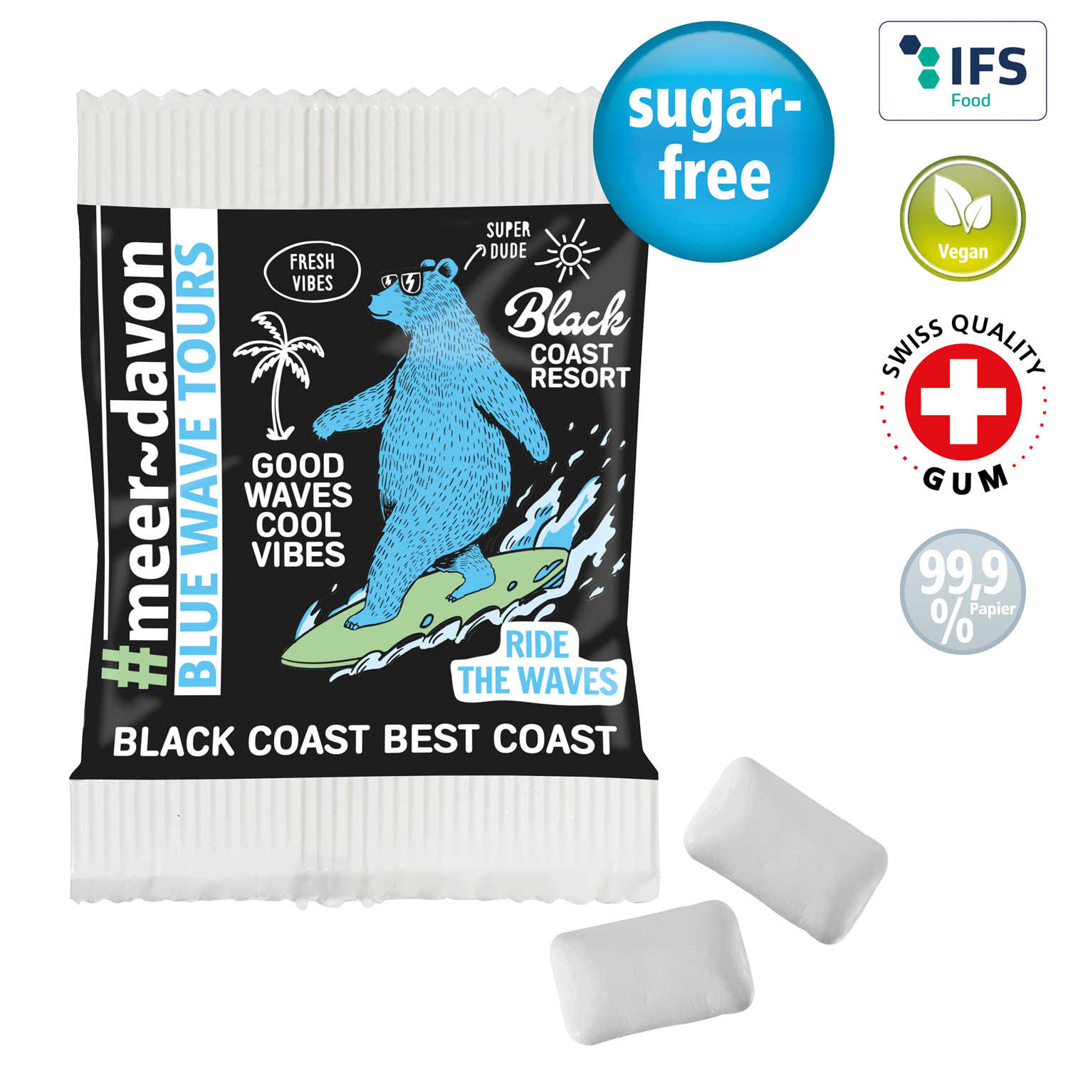 Inhalt: 2 zuckerfreie Kaugummis. Geschmack: Pfefferminz, in weißem Papierwerbetütchen verpackt.