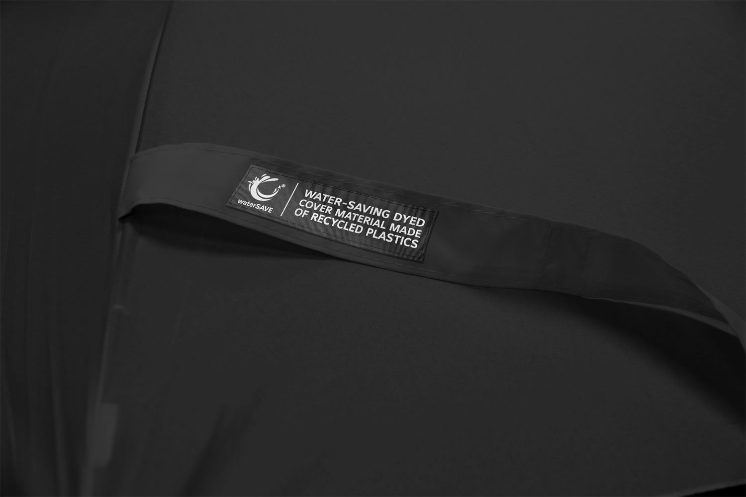 Schicker Taschenschirm mit neuartigem Öffnungs- und Schließmechanismus. Komfortable Doppelautomatik-Funktion zum schnellen Öffnen und Schließen durch Herunterziehen des Rings, hochwertiges Windproof-System für eine maximale Gestell-Flexibilität bei stärkeren Windböen, wassersparend gefärbtes Polyester-Pongee waterSAVE® Bezugsmaterial aus recycelten Kunststoffen, mit waterSAVE®-Label auf dem Schließband, silberne Nickelspitzen, Griff hochglänzend schwarz mit verchromten Applikationen und gewebter Trageschlaufe, Schließband und Futteral mit edlem Druckknopf.