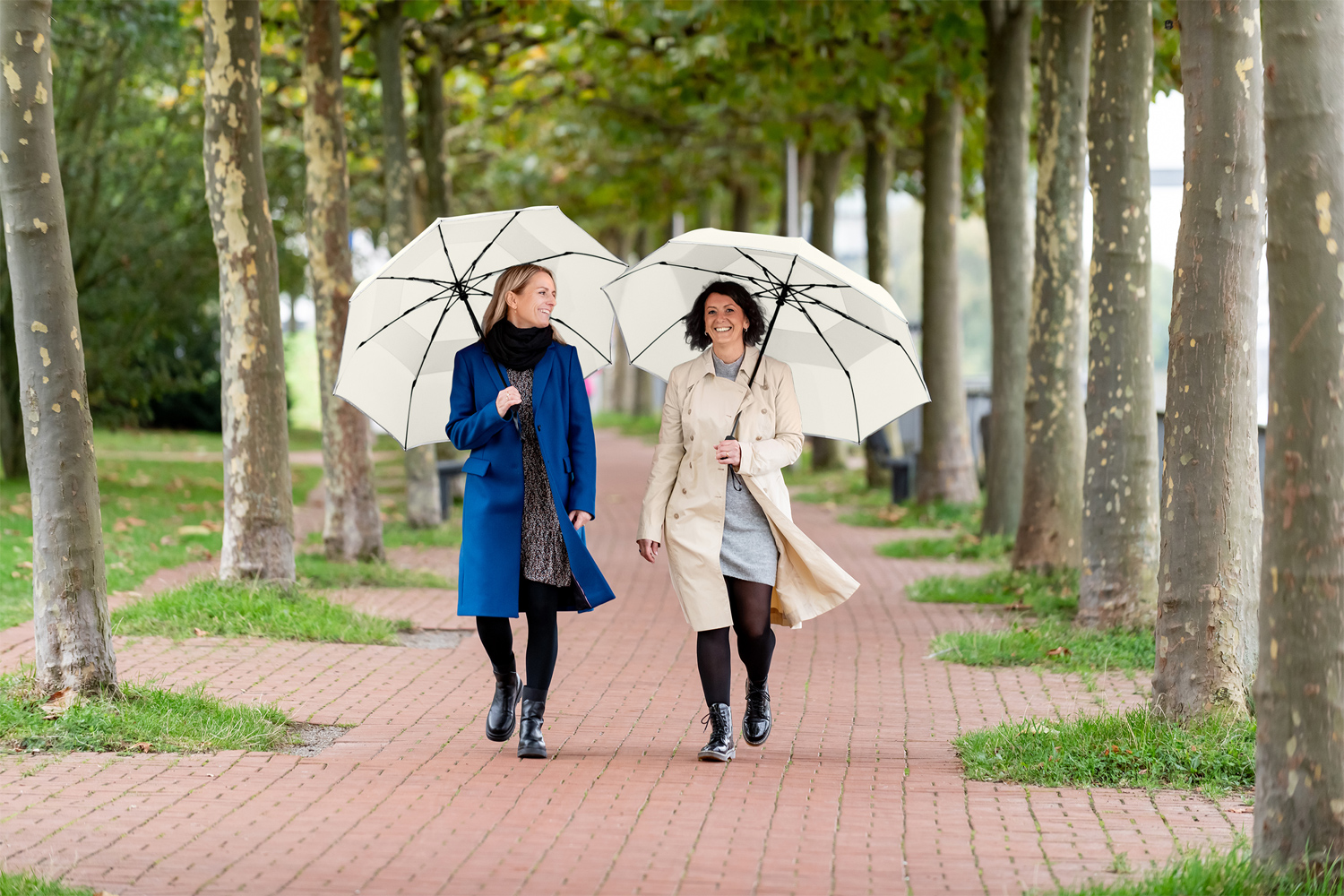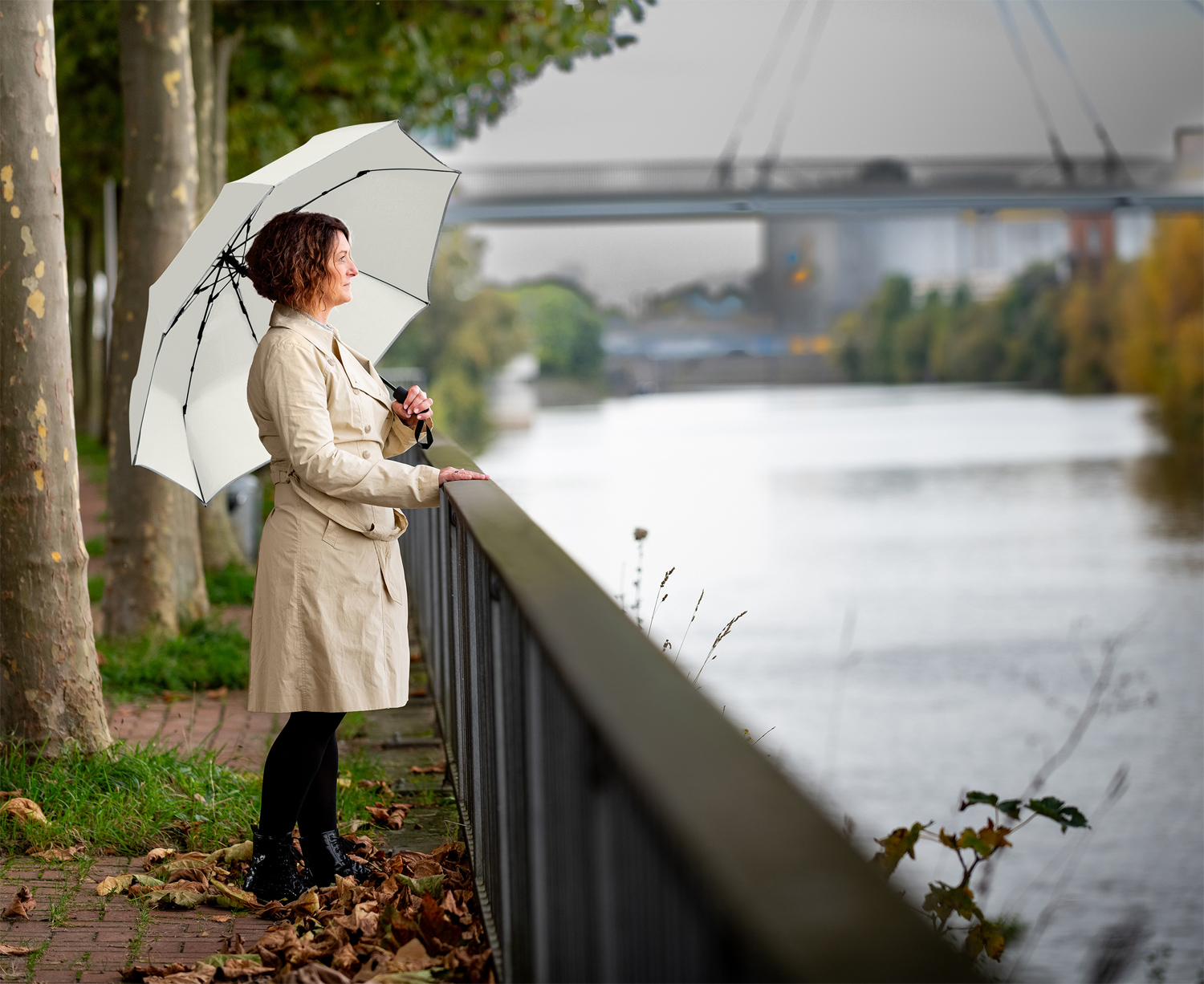 Äußerst stabiler Doppelautomatik-Taschenschirm in Übergröße. Komfortable Doppelautomatik-Funktion zum schnellen Öffnen und Schließen, hochwertiges Windproof-PLUS-System für eine maximale Gestell-Flexibilität bei stärkeren Windböen, flexible Fiberglasschienen, überlappender Ventilationsbezug zur Regulierung von Überdruck durch stärkere Windböen, wassersparend gefärbtes Polyester-Pongee waterSAVE® Bezugsmaterial aus recycelten Kunststoffen und mit modischer Reflexpaspel in Silber, mit waterSAVE®-Label auf dem Schließband, Griff aus recyceltem ABS mit integrierter Auslösetaste und Werbeanbringungsmöglichkeit, komfortables Futteral mit hochwertigem Zipper