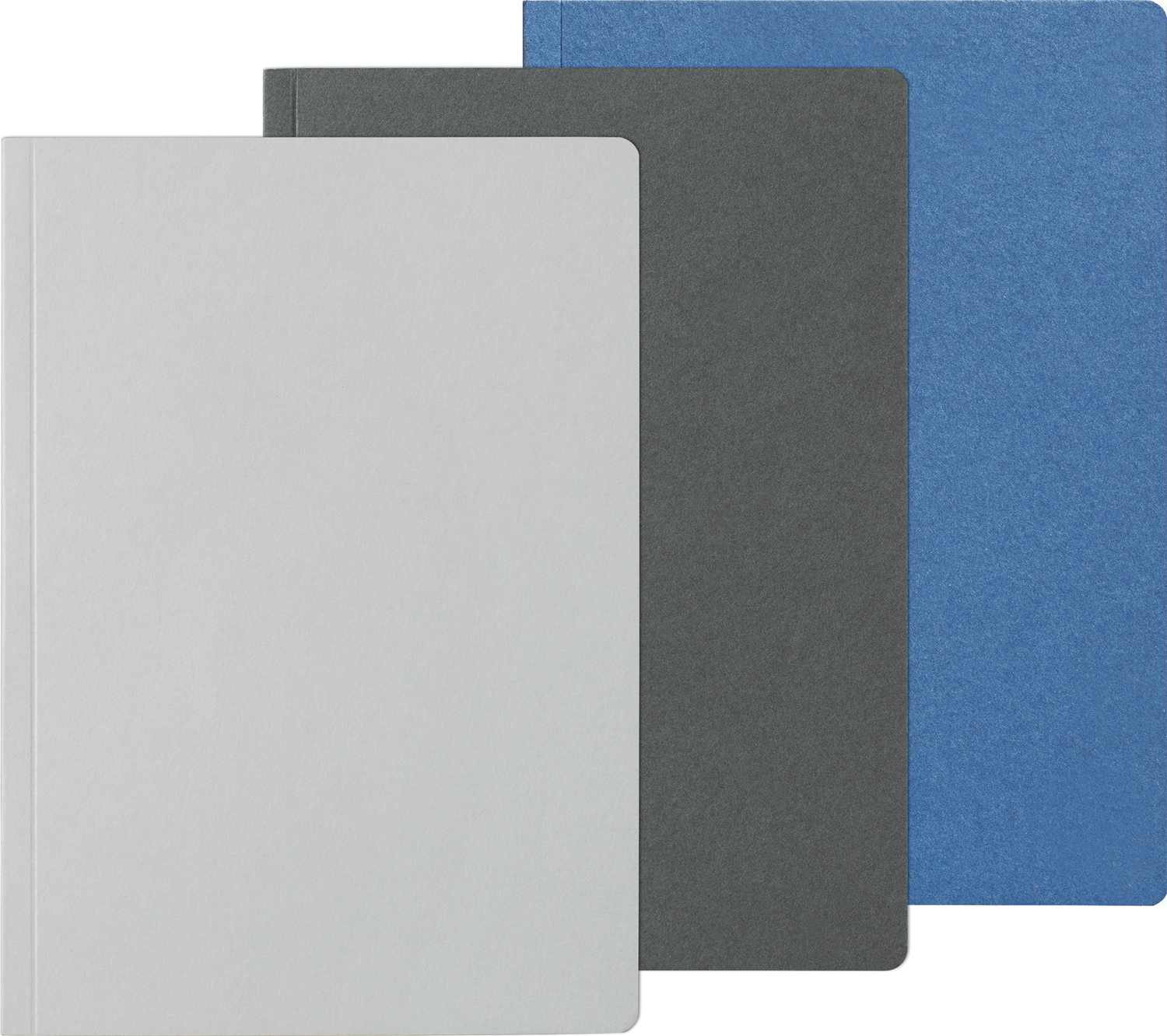 Notizheft mit Broschureinband aus Recyclingkarton in drei Farben. Inhalt aus 192 Seiten Recyclingpapier kariert, Umschlag und Inhalt bündig mit runden Ecken.