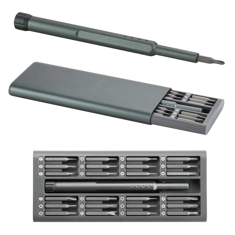 Präzisions-Bit-Set mit 24 Aufsätzen und magnetischem Schraubendreher-Schaft in hochwertiger Metallbox.
