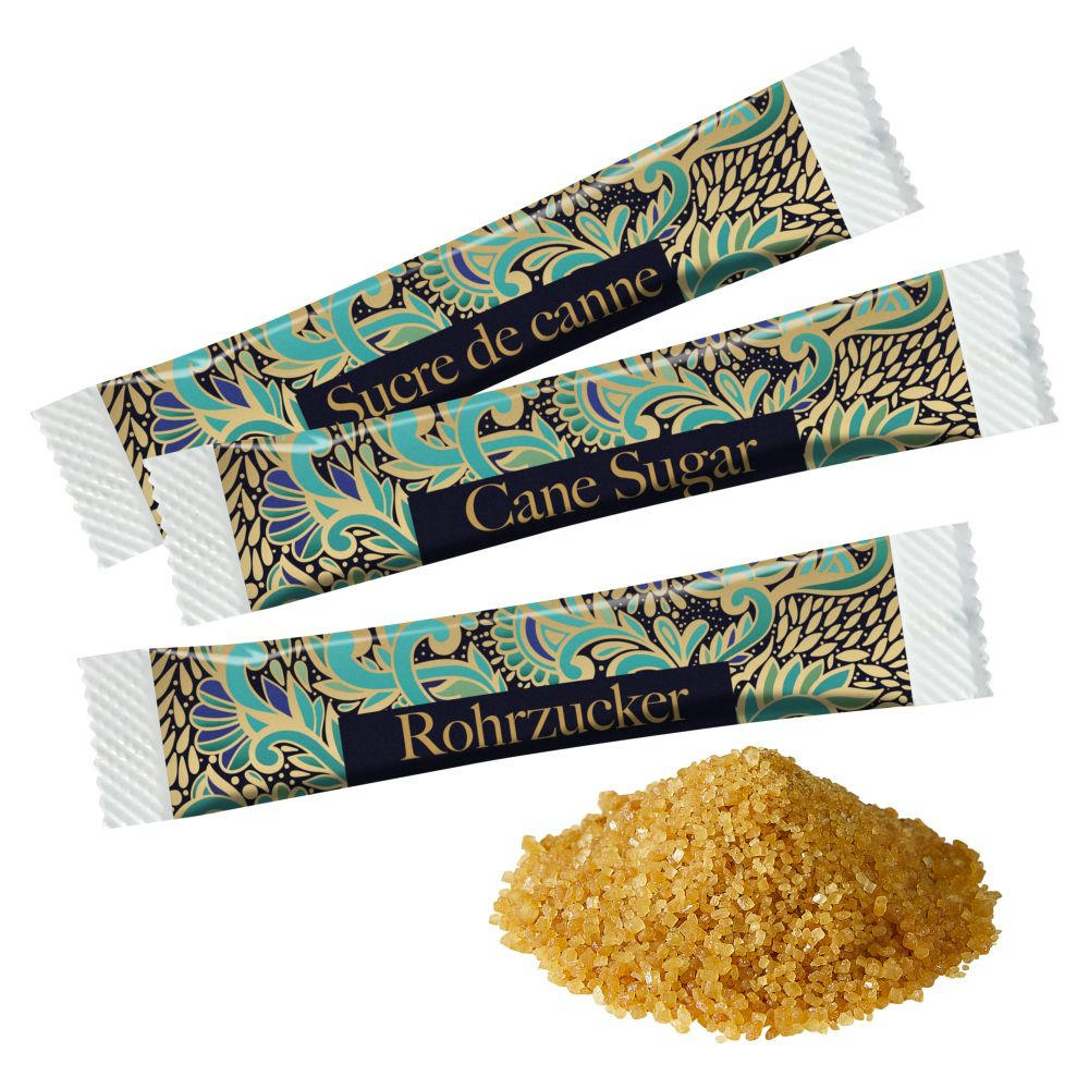 Brauner Rohrzucker in weißem Papierstäbchen verpackt. Haltbarkeit: unbegrenzt bei sachgerechter Lagerung. Preis inkl. 4c Druck.