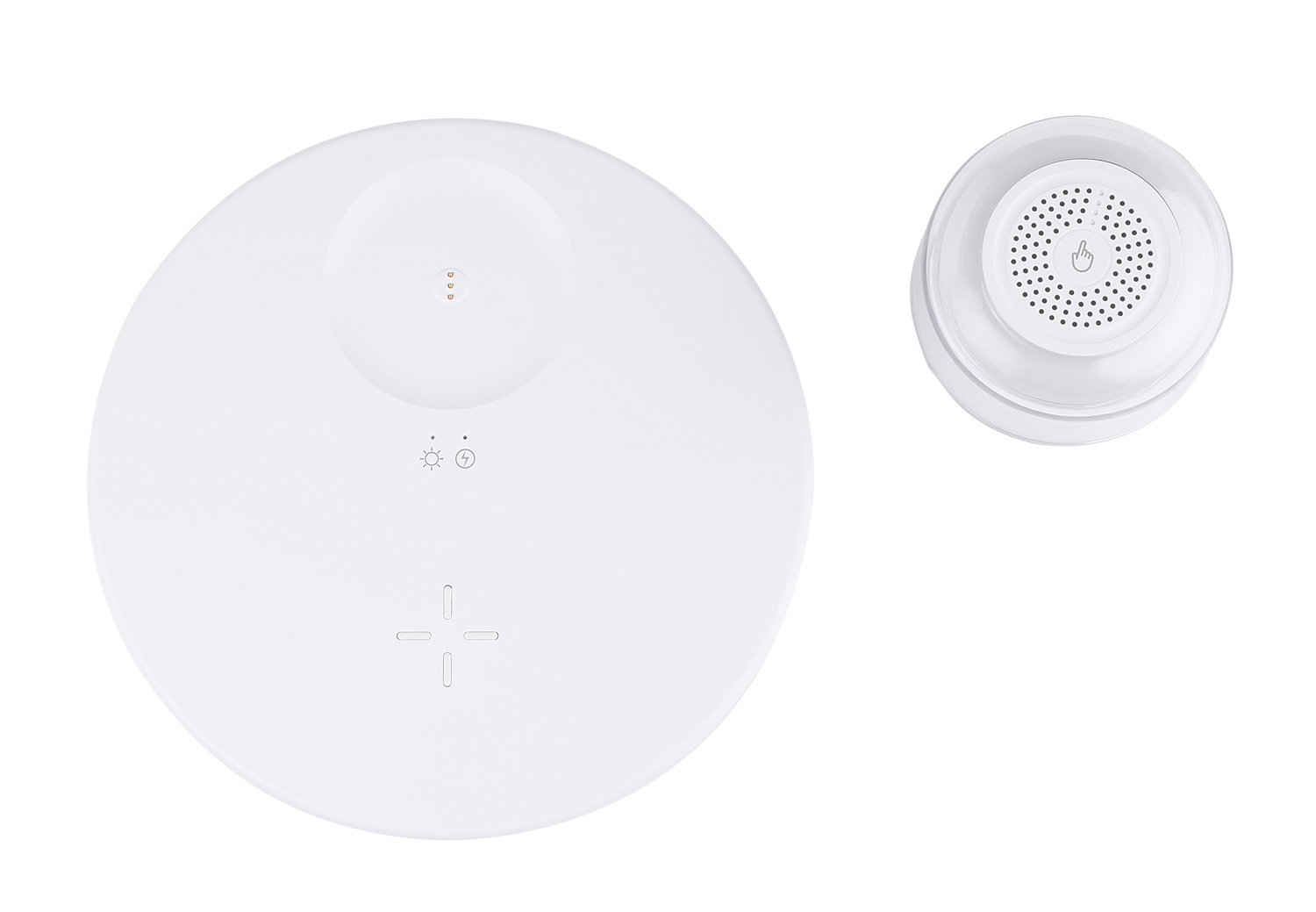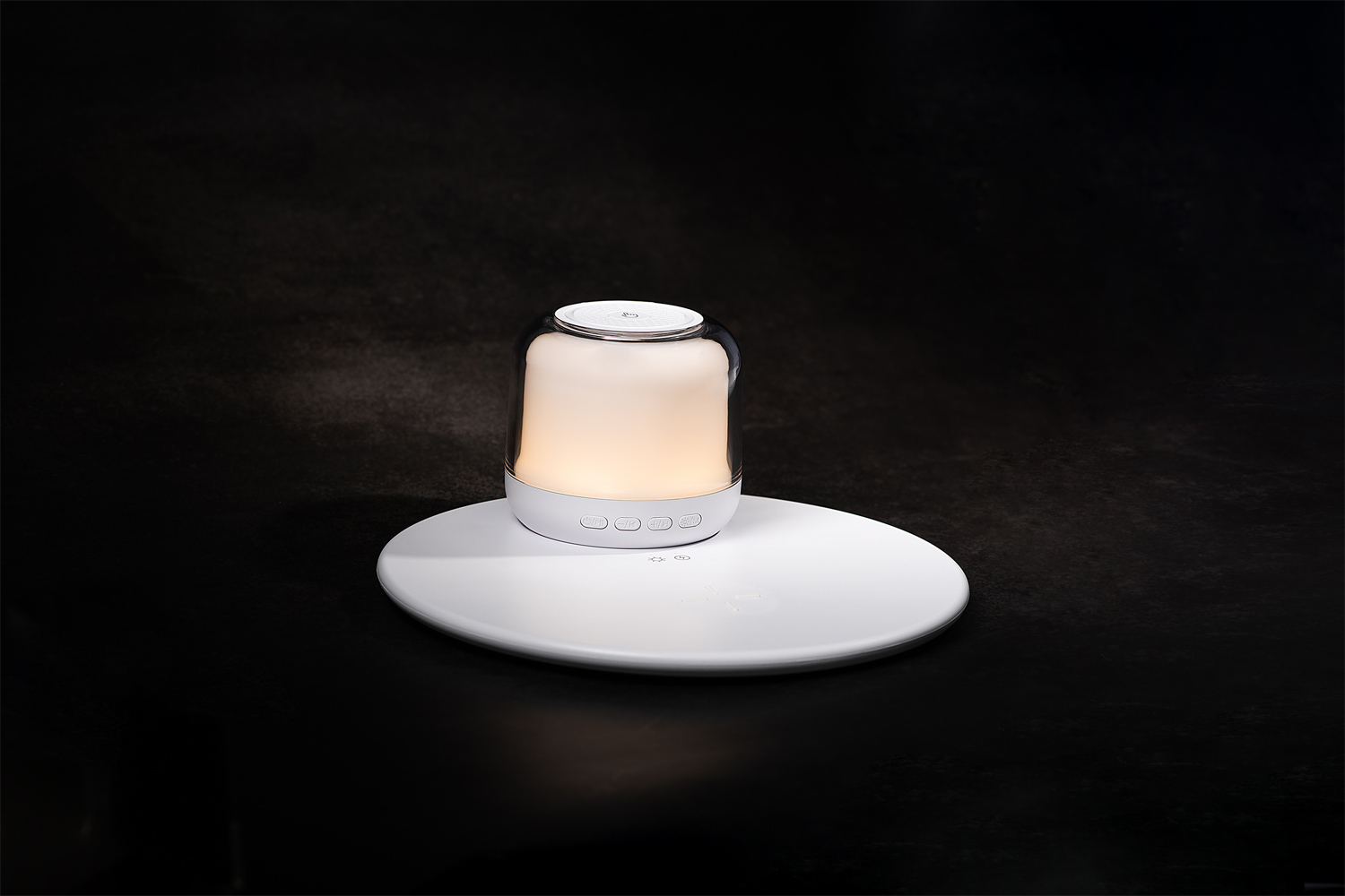Entspannung pur: freut die Augen, streichelt die Ohren und versorgt Ihr Mobiltelefon diskret mit Energie.Wireless Charger Output: DC 5V-1A / 9V-1.66A / 12V-1.25A. Nennleistung des Nachtlichts: 1.2W (6 x 0.2W LED- Module plus 6 x 0.2W RGB-Module). Batteriekapazität: 600 mAh, 3.7V (2.22Wh).