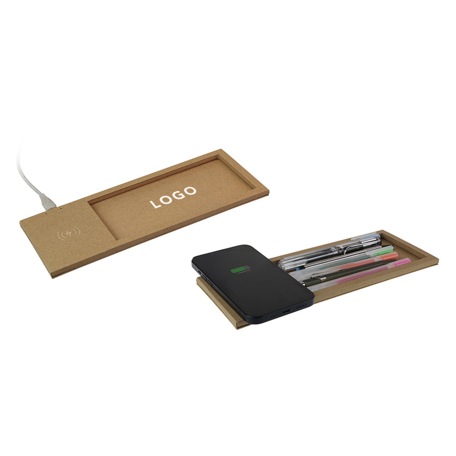 Wireless Ladegerät aus Kraftkarton 10 Watt mit PLA Ladekabel (USB Typ C auf A). Lieferung in braunem Einzelkarton.