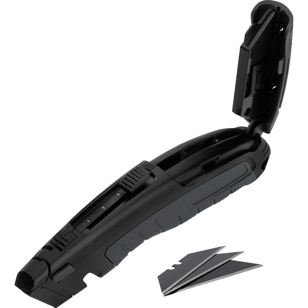 Universal-Trapezklingenmesser mit SK2 Hochleistungsklingen. Hochwertiges Qualitäts-Cuttermesser mit Aluminiumgehäuse und 3-fach arretierbarem Klingenausschub. Für Rechts- und Linkshänder geeignet.