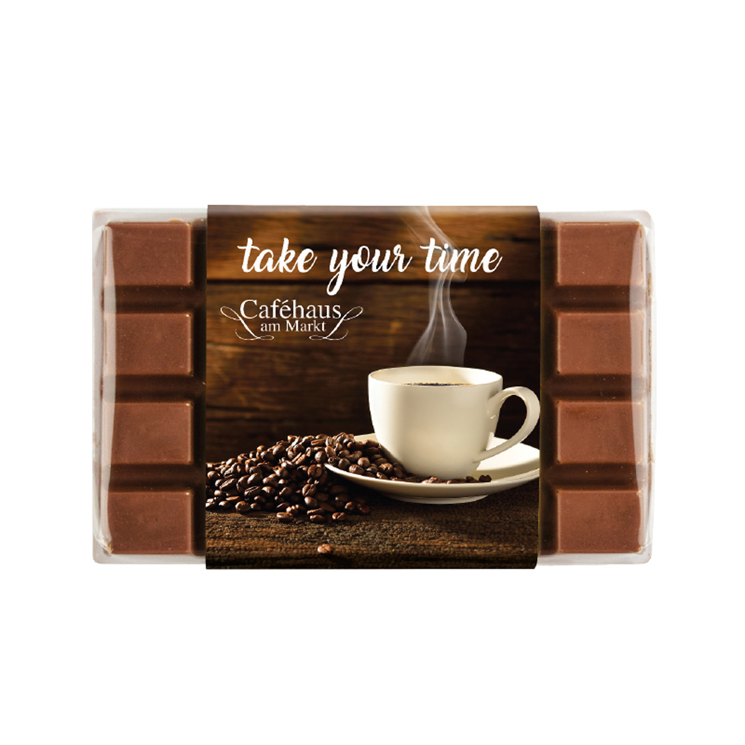 Design Schokolade mit Fairtrade Siegel im Pergaminpapier mit weißer Papierbanderole, individuell bedruckt. Inhalt: Deutsche Markenschokolade, Alpenvollmilchschokolade mit Fairtrade-Zutaten, 10 g. Haltbarkeit: 12 Monate.