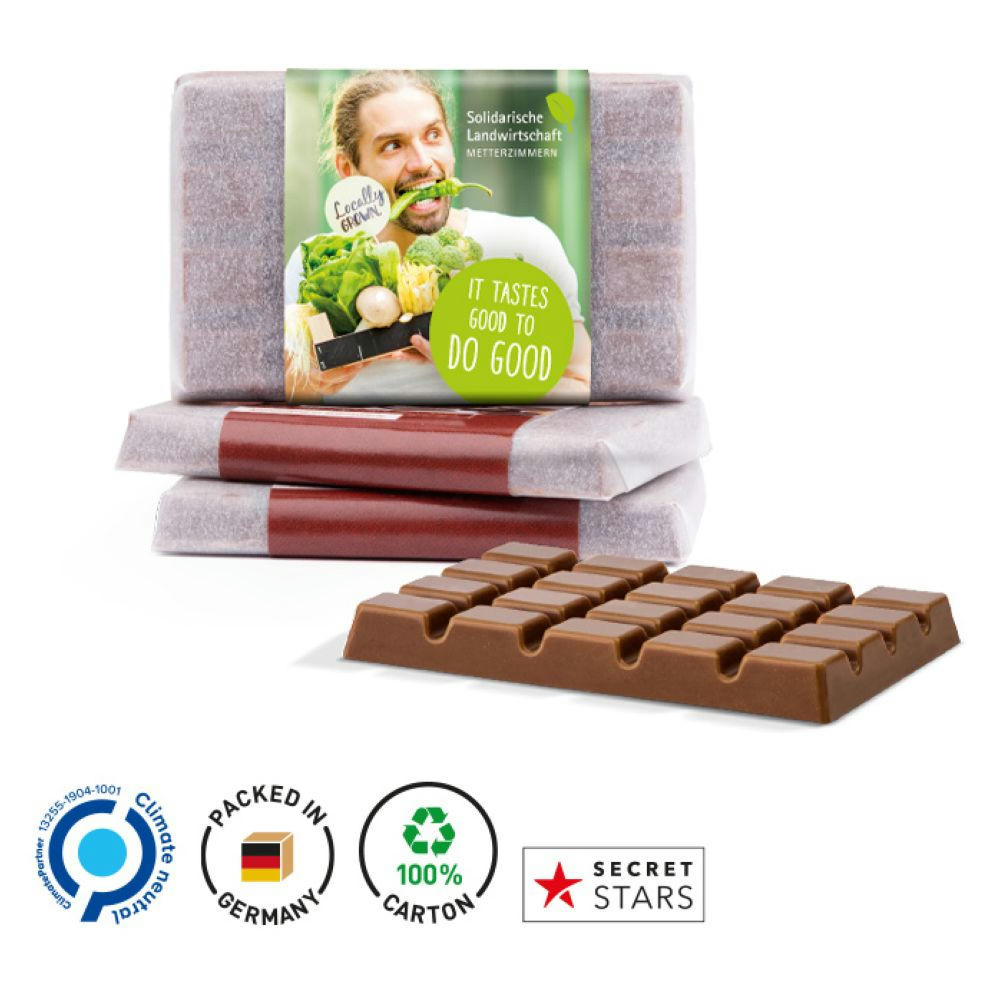 Fairtrade-Zutaten, Nachhaltig, Schokolade, Süßigkeiten, klimaneutraler Druck, kompostierbare Folie, süßes