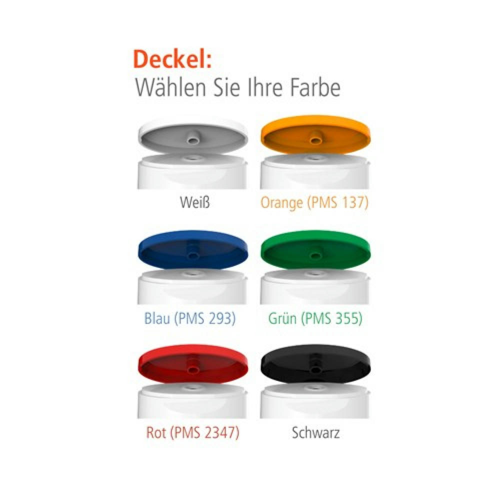 Werbeanbringung und Verpackung: * Klappdeckel oben und unten erhältlich in 6 wählbaren Farben: blau, orange, grün, rot, weiß oder schwarz. * Handliches Format: 5,4 x 2,6 x 14,9 cm * Etikett auf Vorder- und Rückseite der Flasche * Druck in 4c CMYK