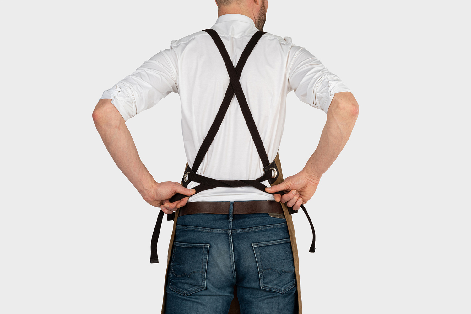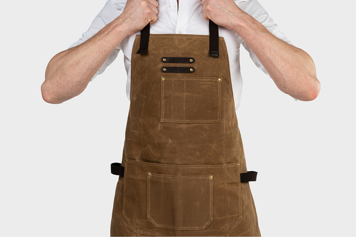 Gewachste Baumwolle, Rückenträger individuell verstellbare Webbänder, vorne mit aufgesetzten Taschen, Schlaufen an den Seiten, Akzente in Lederimitat.