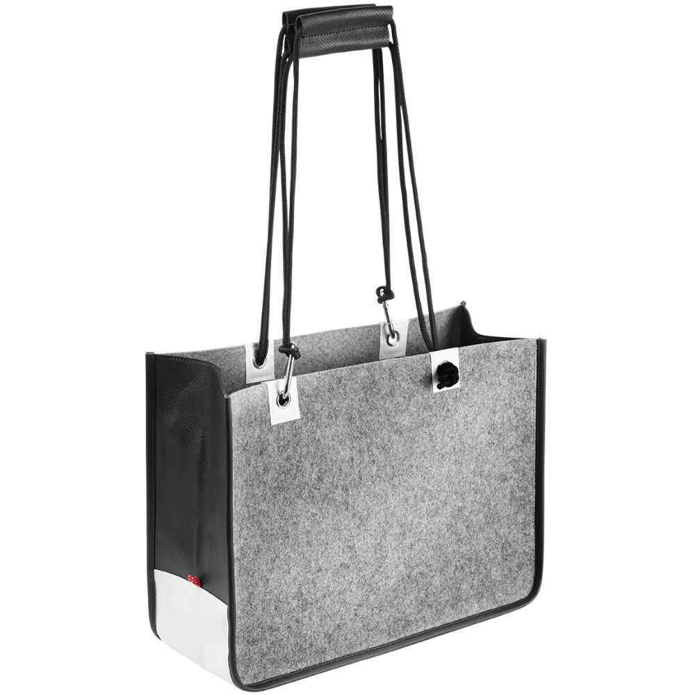 Schicke Shopping Tasche im interessantem Materialmix aus Filz, LKW Plane und PU, offenes Hauptfach, Metallöse für Handschlaufen in Tarpaulin eingefasst, Tragegriffe aus rundgewebtem Polyester, Handgriffe in edlem PU in Loch Optik. Innentasche abnehmbar aus 300D Nylon. Volumen: 22,5 Liter.