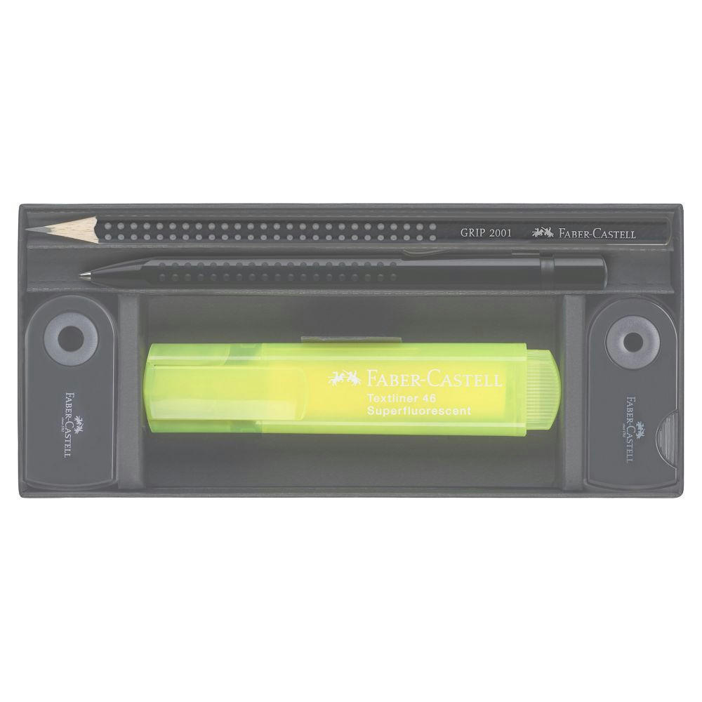 Office Set mit hochwertigem Druckkugelschreiber Grip 2010, auswechselbare dokumentenechte M-Mine. Dazu der Bleistift Grip 2001 mit Härtegrad HB in ergonomischer Dreikantform. Der Radierer (PVC-frei) und die Spitzdose Sleeve Mini komplettieren das Set mit dem nachfüllbaren Textliner mit Superleuchtkraft. Eingelegt in einer Geschenkverpackung mit transluzentem Schuber.