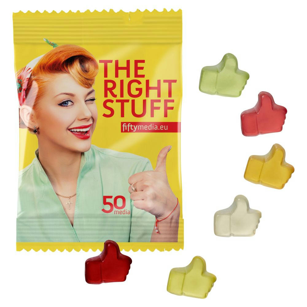 Fruchtgummi-Standardformen mit 10 % Fruchtgehalt aus Fruchtsaftkonzentrat, natürlichen Aromen und färbenden Pflanzenauszügen, farblich und geschmacklich bunt gemischt, in glänzend- oder matt-kaschiertem transparentem, alternativ weißem Werbetütchen verpackt. Kompostierbare Folie gegen Aufpreis möglich. Haltbarkeit: ca. 12 Monate. Inkl. 1–5c-Druck.