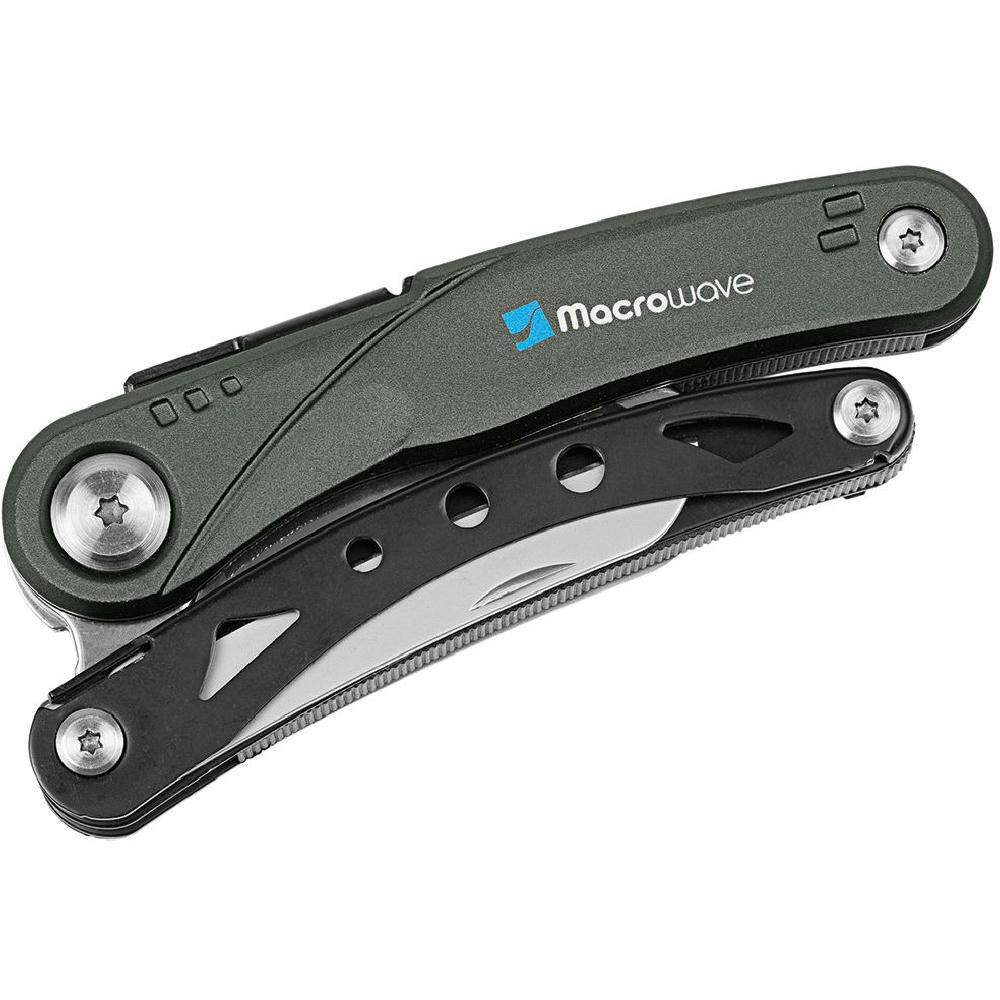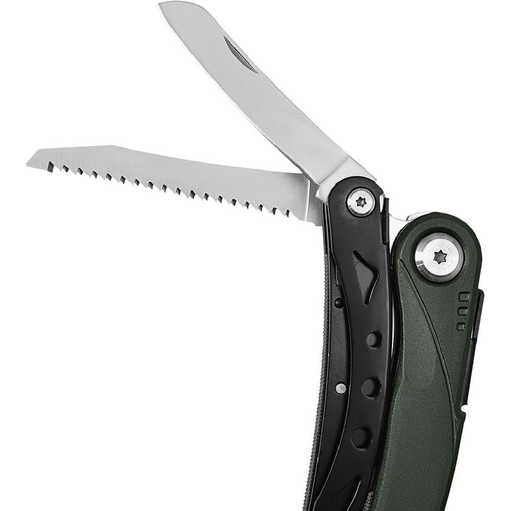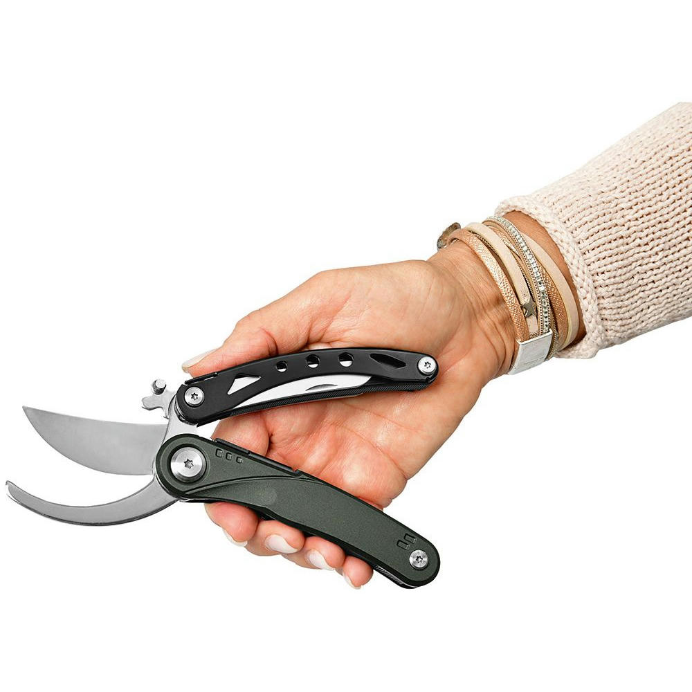 Multifunktions-Gartenschere mit 5 Funktionen: Gartenschere, Messer (Klingenlänge 70 mm), Holzsäge, Wurzelzieher.