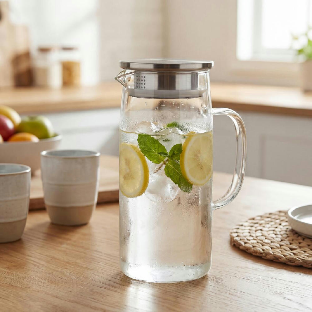 Karaffe aus Borosilikatglas mit Edelstahl- und Silikonelementen. Mit 1 l Füllvolumen ideal für Wasser, Saft oder Eistee. Durchdachtes Design für einfache Handhabung und leichte Reinigung. Stilvoll, funktional und perfekt für Alltag oder Büro.