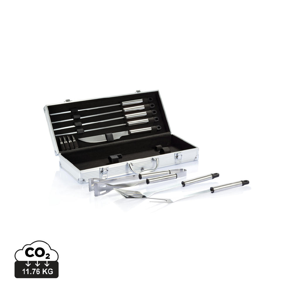 12-teilig, Aluminiumkoffer, BBQ, Bratenheber, Edelstahl, Grillgabel, Grillzange, Grillzubehör, Maiskolbenhalter, Messer, Outdoor, Spieße, grillen, set