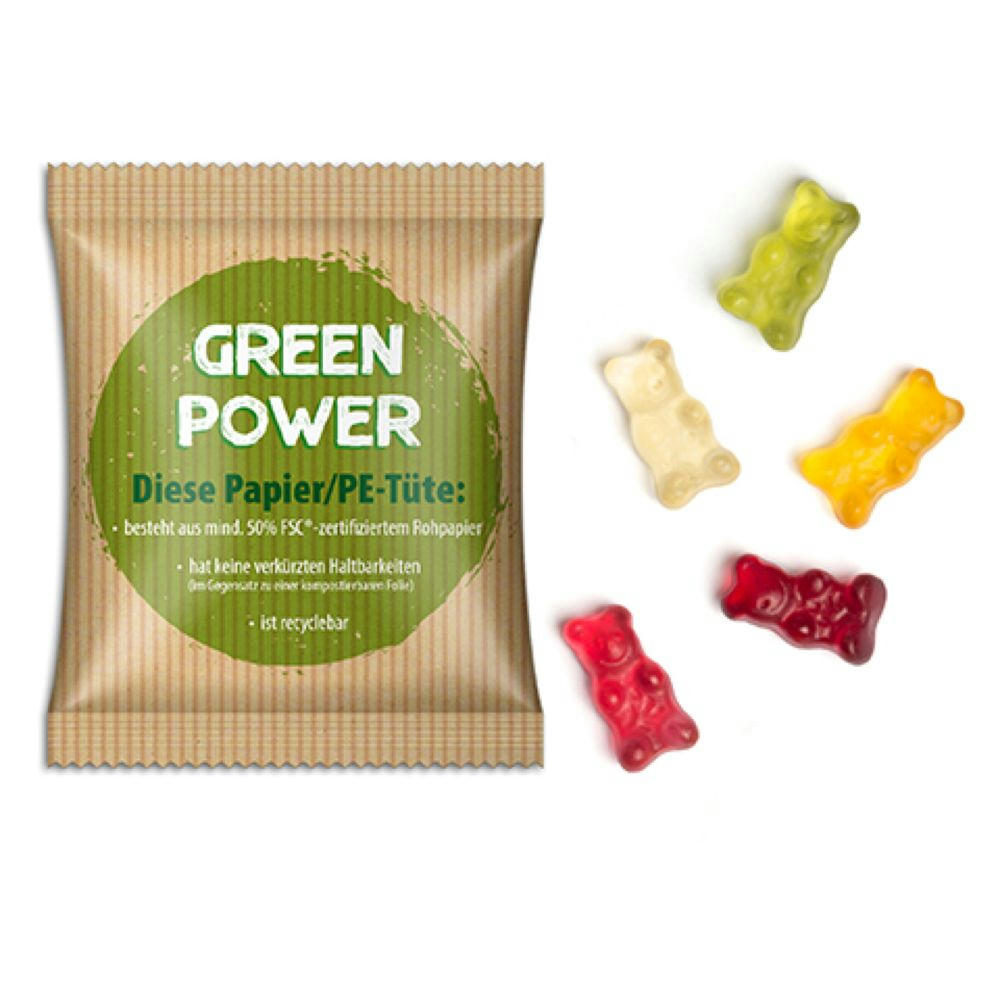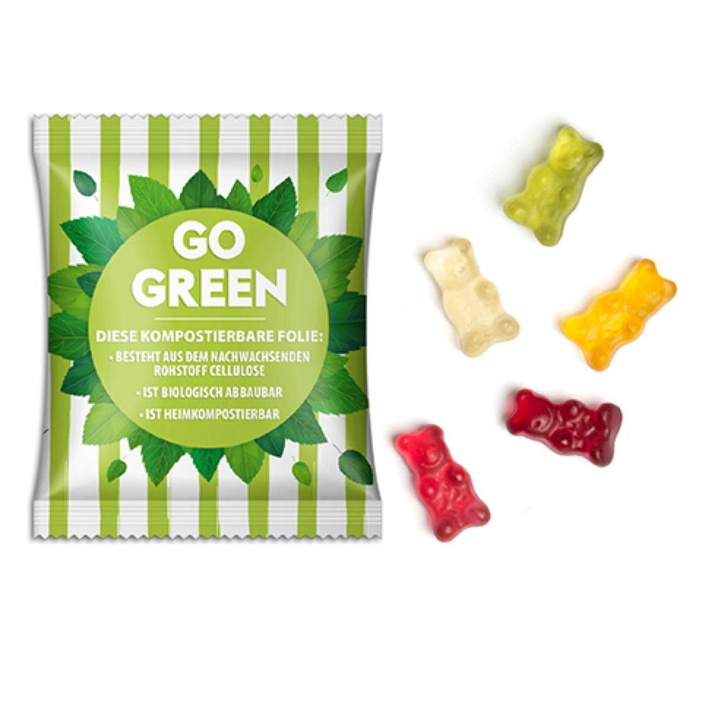 Vegane Gummibärchen im individuell bedruckten Werbetütchen. Variante : Gummibärchen vegan | 20 g | Standard-Folie transparent | 1-farbig