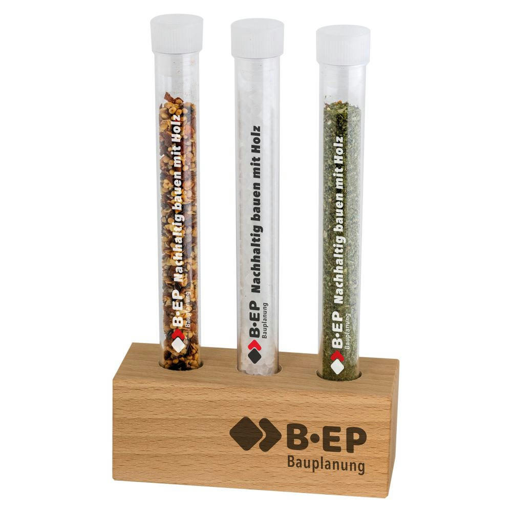 Edler und nachhaltiger Aufsteller aus geöltem Buchenholz für 3 Reagenzgläser. Veredelung des Aufstellers auf Anfrage. Exkl. Reagenzgläser.