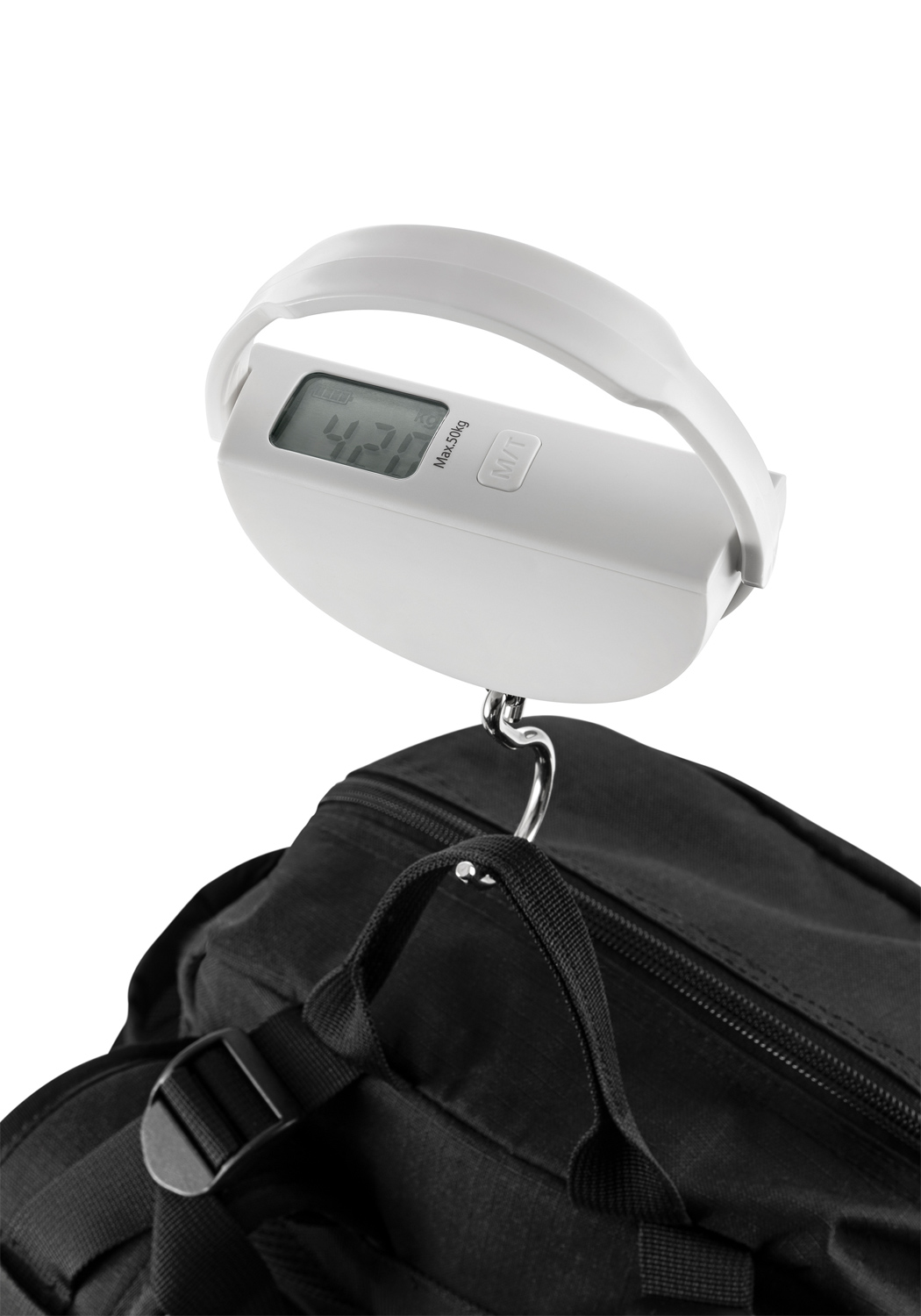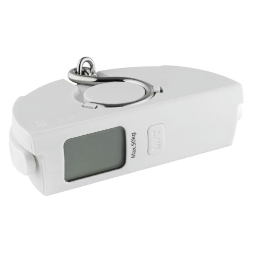 Innovative Travelwaage mit umweltfreundlicher Dynamofunktion (d.h. immer einsatzbereit ohne Batterien), sehr kompakt, mit Digitaldisplay und Maxwertfixierung.