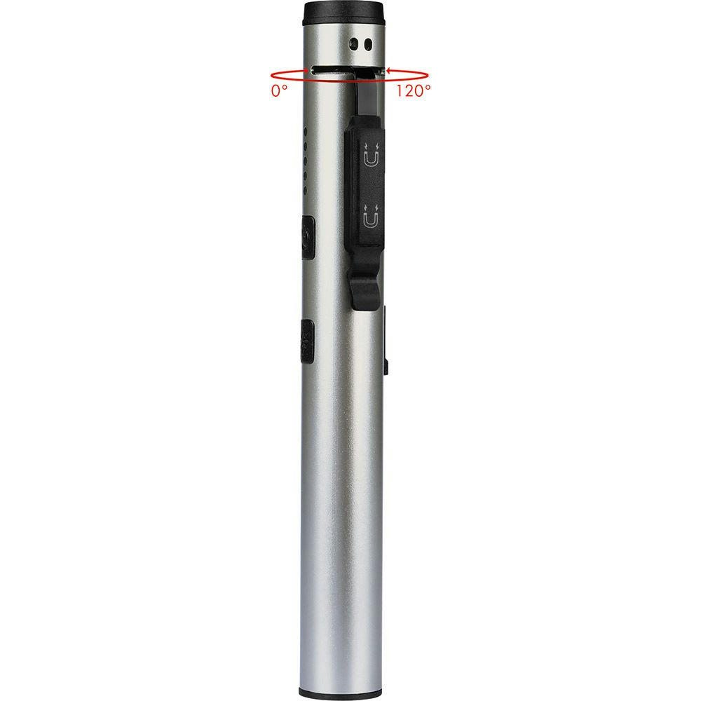 Gehäuse: Aluminium eloxiert. Leuchtmittel: Frontleuchte 5 W COB LED, Inspektionsleuchte 3 W LED, Laser 650 nm, UV-Licht 365 nm. Lichtwerte: Frontleuchte 450 Lumen, Inspektionsleuchte 140 Lumen. Ladezeit: ca. 3 Stunden. Leuchtdauer: ca. 2,5 Stunden (Frontleuchte 450 Lumen), ca. 2,5 Stunden (Inspektionsleuchte 140 Lumen), ca. 4 Stunden (UV-Licht). Leuchtmodi: Frontleuchte 100 % Power weißes Licht dimmbar, Inspektionsleuchte 100 % Power weißes Licht dimmbar, UV-Licht blau dimmbar, Laser rot. Equipment: 120° drehbarer Clip mit starkem Magnet, Ladekontroll-LED, USB (Typ A) / USB (Typ C) Ladekabel (50 cm Länge). Schutzklasse: IPX2. Stromversorgung: 3,7V 800mAh Li-Ionen Akku Typ 14500 (inkl.). Verpackung: schwarze Geschenkverpackung.