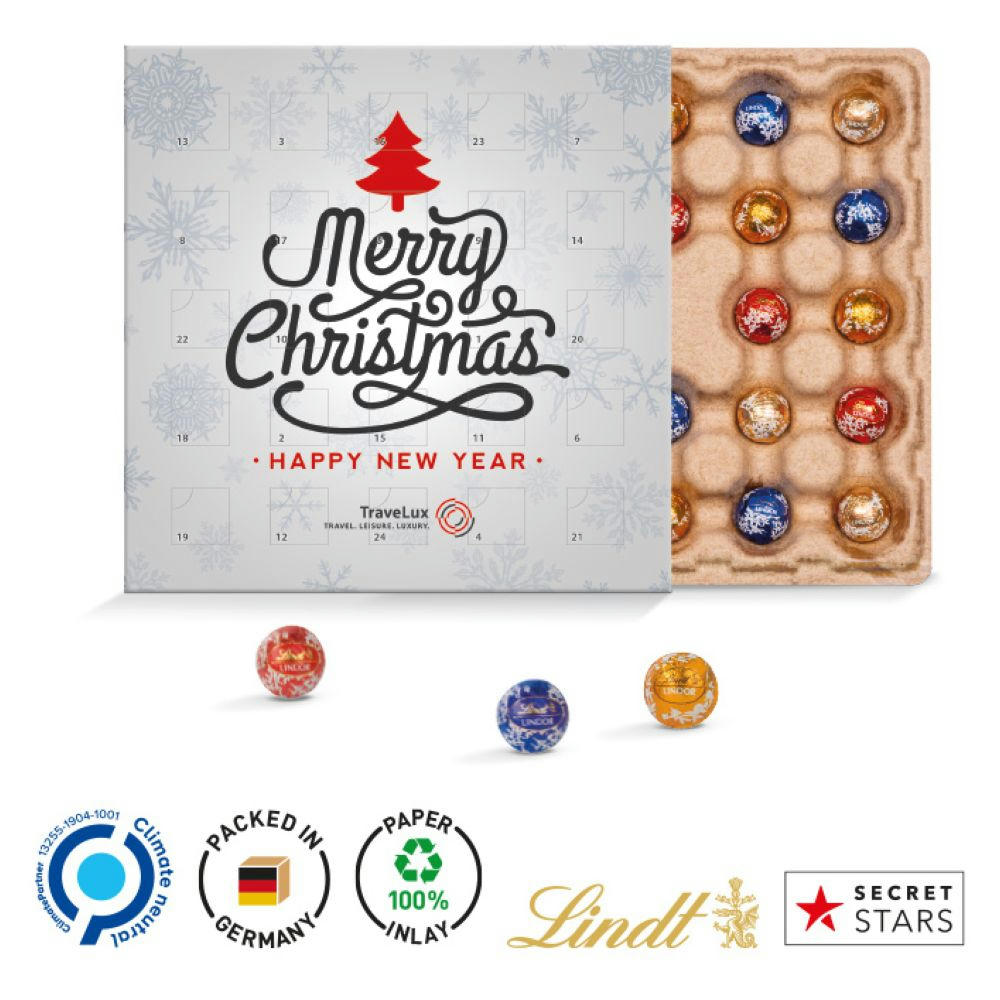 Adventskalender in Vollkartonhülle mit kompostierbarem Inlay, individuell bedruckt. Mit ausklappbarem Tischaufsteller und Aufhänger im Rücken integriert. Inhalt: 24 LINDOR Mini Kugeln von Lindt, bunt gemischt, 109 g Saisonartikel - solange der Vorrat reicht!