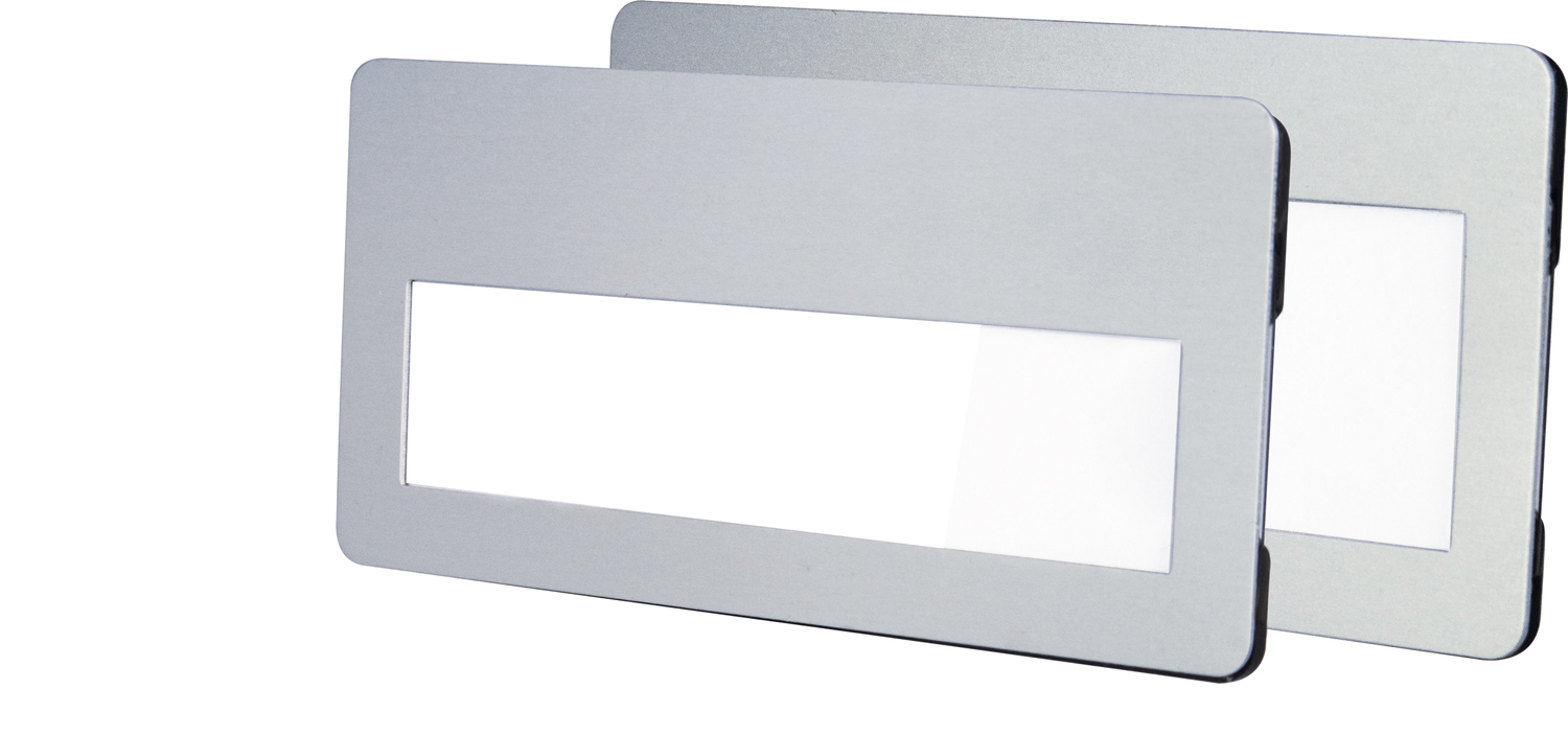 Metallfront des Schildes ist in verschiedenen Farben erhältlich. Für die Rückseiten werden schwarze Rückenplatten aus recyceltem Material mit praktischer Einschubmöglichkeit verwendet. Inkl.Magnetbefestigung. Namenseinleger zur Beschriftung separat erhältlich.