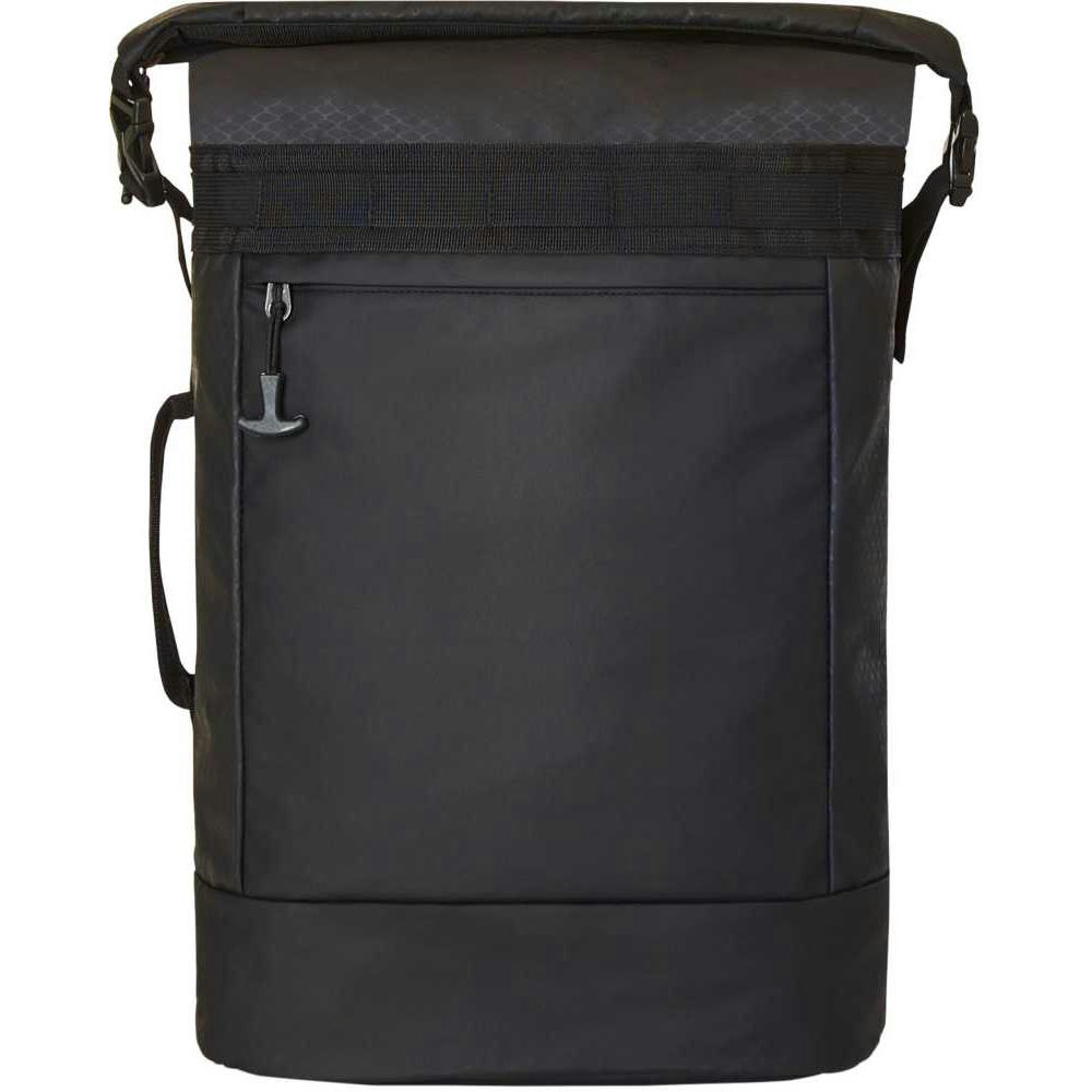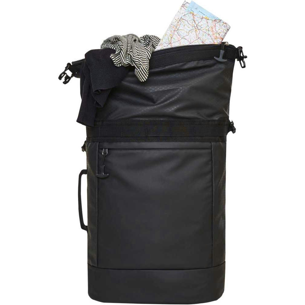 aufwändig gearbeiteter Rolltop-Rucksack; Reißverschluss-Hauptfach mit seitlichen Steckverschlüssen; gepolstertes Einsteckfach innen; große Reißverschluss-Vortasche; Funktions-Schaufenband auf der Front; rückseitig Befestigungsschlaufe für Trolley-Gestänge; verstecktes Reißverschluss-Fach; gepolstertes Tragesystem mit höhenverstellbarem Brustgurt; sowohl seitlicher als auch rückseitiger Handgriff