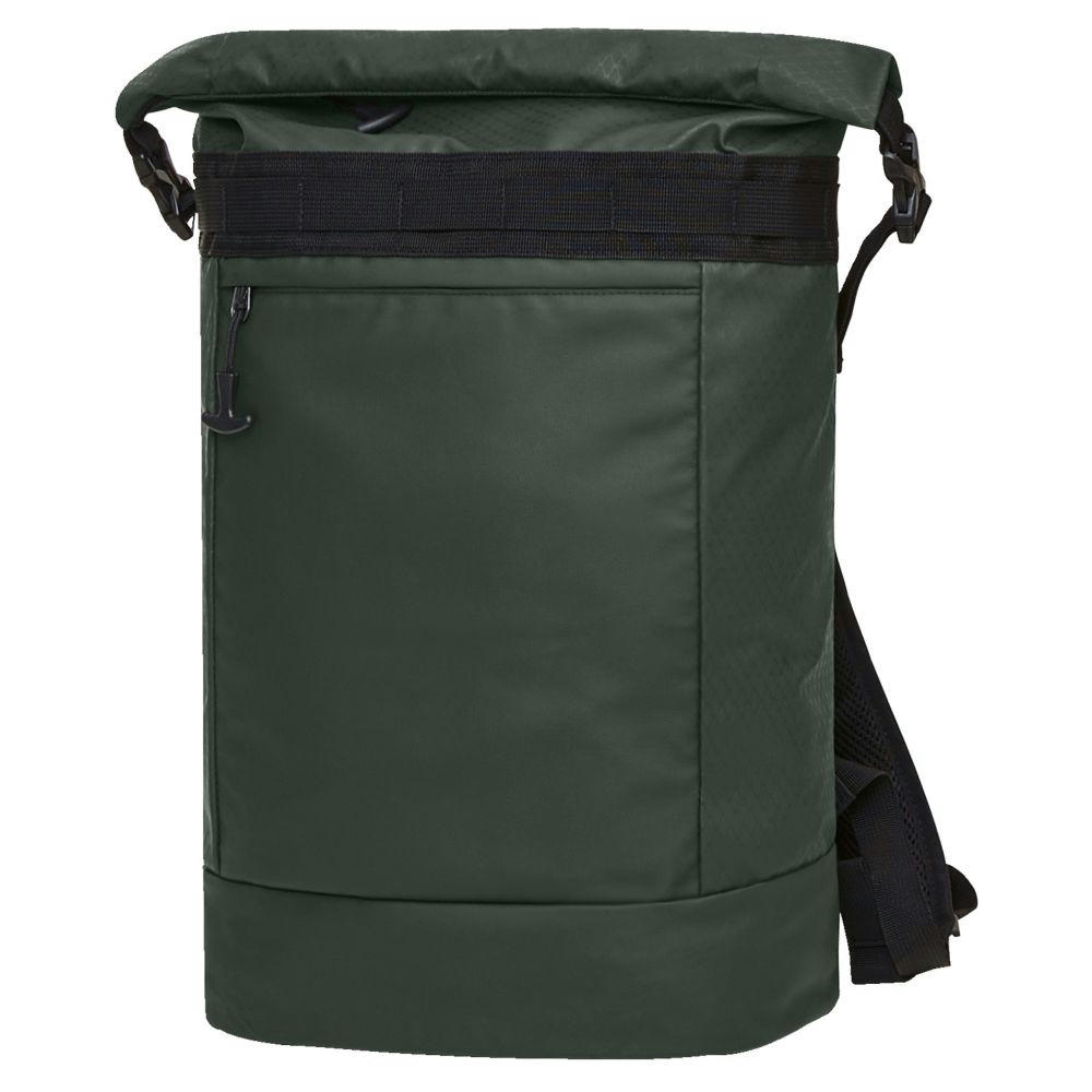 aufwändig gearbeiteter Rolltop-Rucksack; Reißverschluss-Hauptfach mit seitlichen Steckverschlüssen; gepolstertes Einsteckfach innen; große Reißverschluss-Vortasche; Funktions-Schaufenband auf der Front; rückseitig Befestigungsschlaufe für Trolley-Gestänge; verstecktes Reißverschluss-Fach; gepolstertes Tragesystem mit höhenverstellbarem Brustgurt; sowohl seitlicher als auch rückseitiger Handgriff