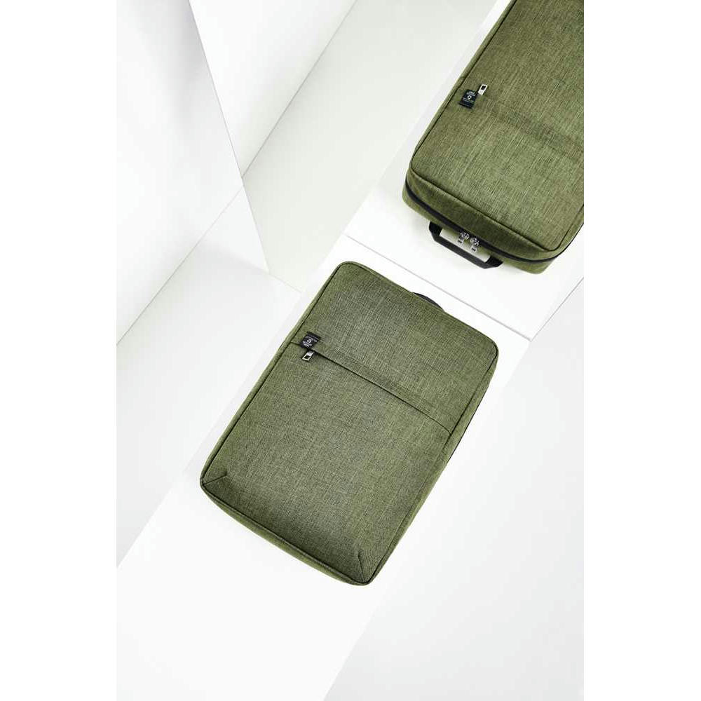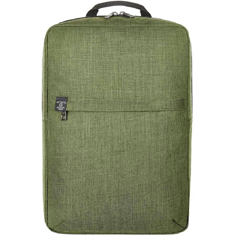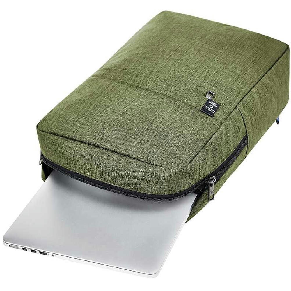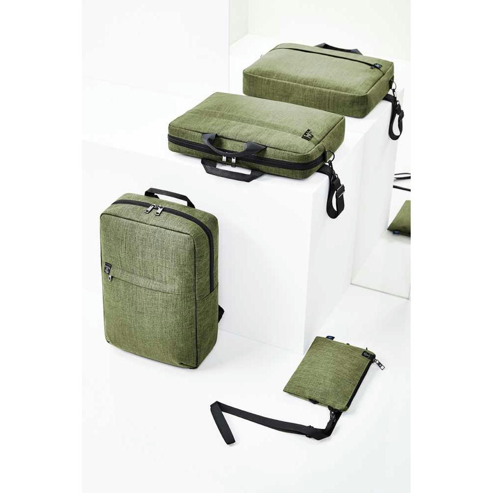 gradlinig gearbeiteter Rucksack; rPET Obermaterial; großes Hauptfach mit 2-Wege-Reißverschluss und gepolstertem Notebookfach; Reißverschluss-Vortasche; aufwändig gepolsterter Rücken mit verstecktem Reißverschlussfach; längenverstellbare gepolsterte Schultergurte mit Gummischlaufen zum Befestigen von z.B. Sonnenbrille; Handgriff
