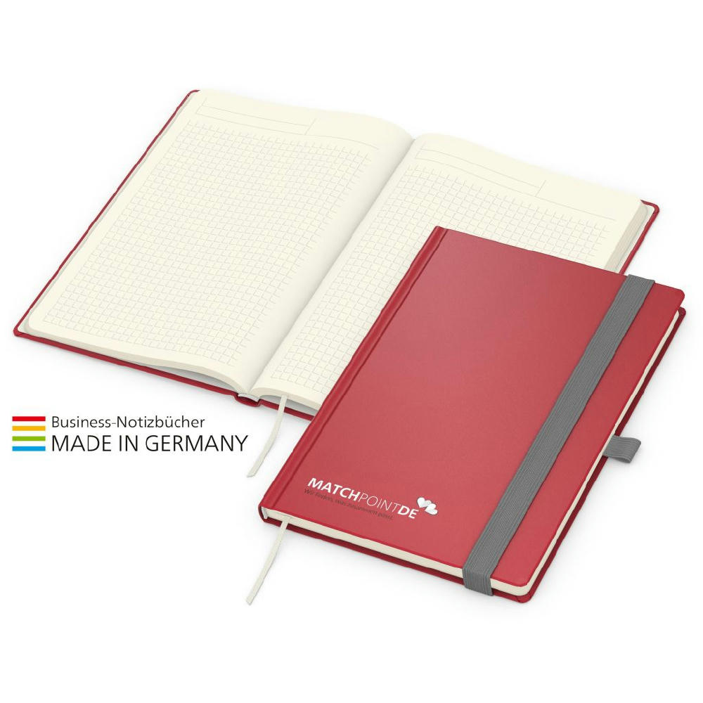 Modern und mit Vollausstattung: Vision-Book in mattem, glattem Kunstledereinband und farblich abgestimmter Vollausstattung mit Gummiband und Stiftschlaufe.