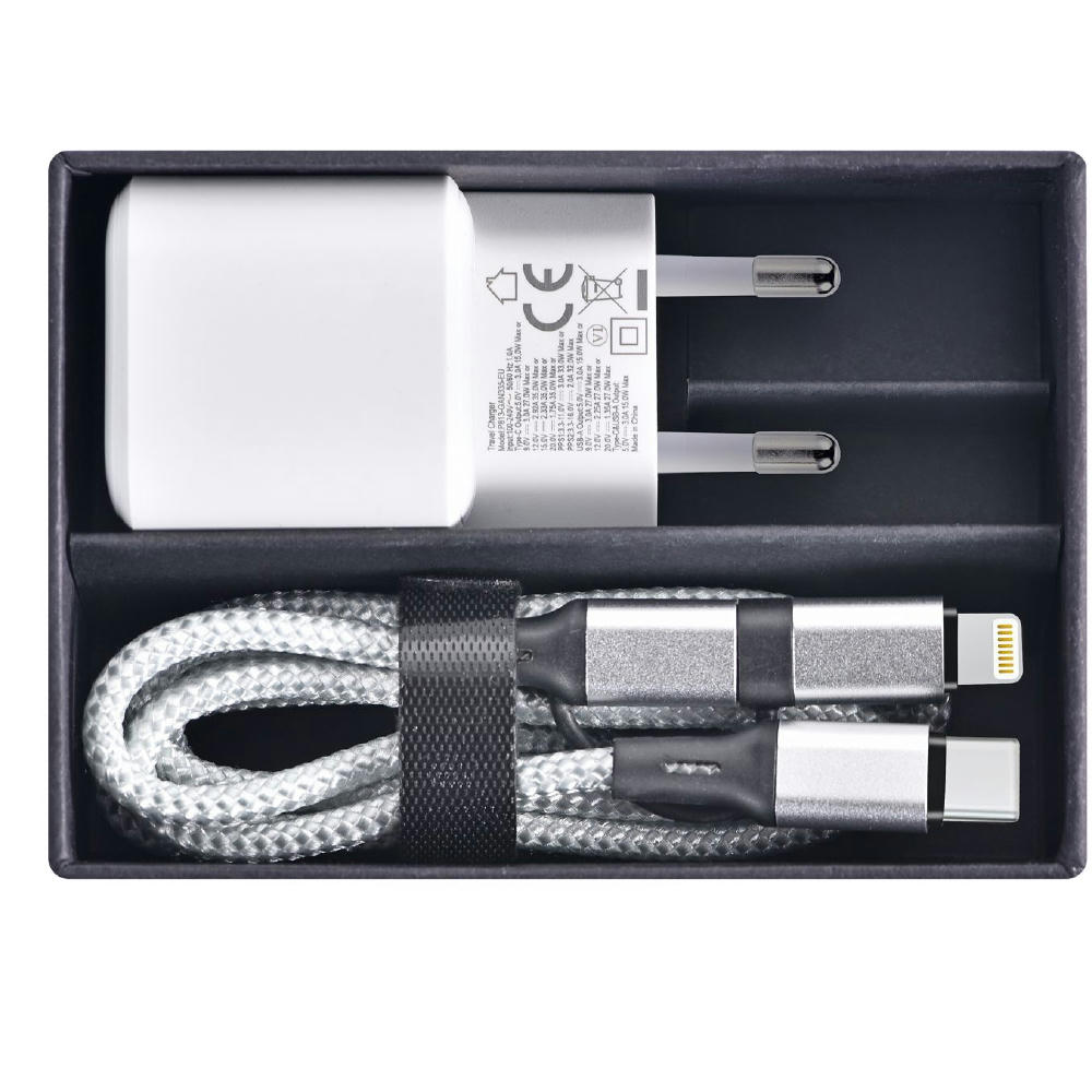 Netzadapter und passendes Ladekabel Type-C auf Lightning und Type-C mit Power Delivery Fastcharge.
