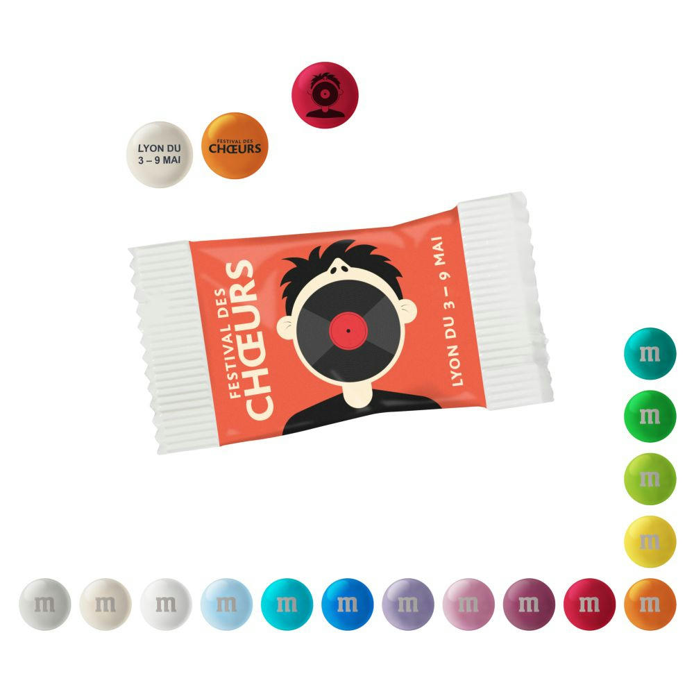 Personalisierte M&M’S Schokolinsen mit individuellem Druck auf den Linsen und verpackt im Papierwerbetütchen. Drucken Sie nicht nur Texte (maximal 2 Zeilen zu je 9 Zeichen), sondern auch Bilder oder Logos variabel kombiniert auf 1, 2 oder 3 verschiedenfarbigen Schokolinsen. Insgesamt stehen 15 Linsenfarben zur Wahl. Hinweis: Rote und wolkefarbene Linsen sind sortenrein nicht möglich. Haltbarkeit: ca. 4 Monate. Inkl. 4c Druck.