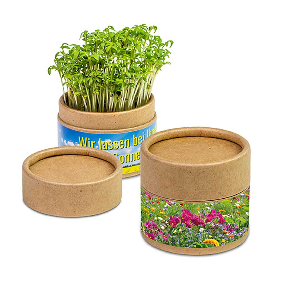 Aus Kraftpapier produziert und mit Wachs versiegelt, ist der Pflanz-Cup ein Highlight im Bereich „werben&wachsen“. Im runden Behältnis werden mit einer Substrattablette als Erde, Samen nach Wahl und Wasser schöne Pflänzchen für Fenstersims oder Bürotisch herangezogen. Die umlaufende Banderole kann individuell bedruckt werden. Verschlossen wird dieses kreative Produkt mit einem Deckel, ebenfalls aus Kraftpapier.