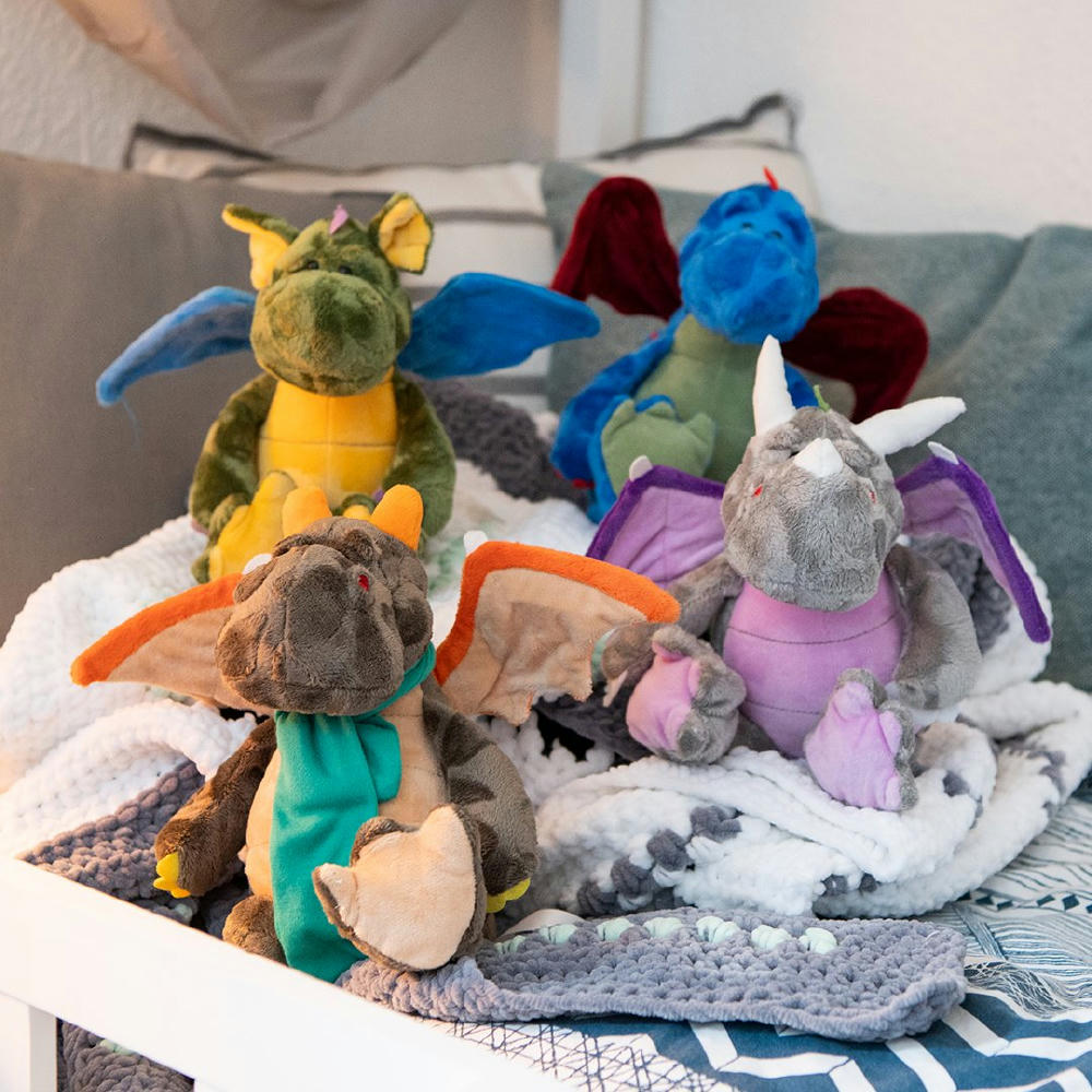Drachendame Smilla ist unglaublich stark. Dank ihrer lieblichen Optik in zartem Rosa und Lila und ihrer biegsamen Flügel, beschützt sie die Prinzessinnen dieser Welt, vor bösen Träumen und großen Brüdern ganz von alleine. Eine wirklich drachenstarke Kuschelfreundin.