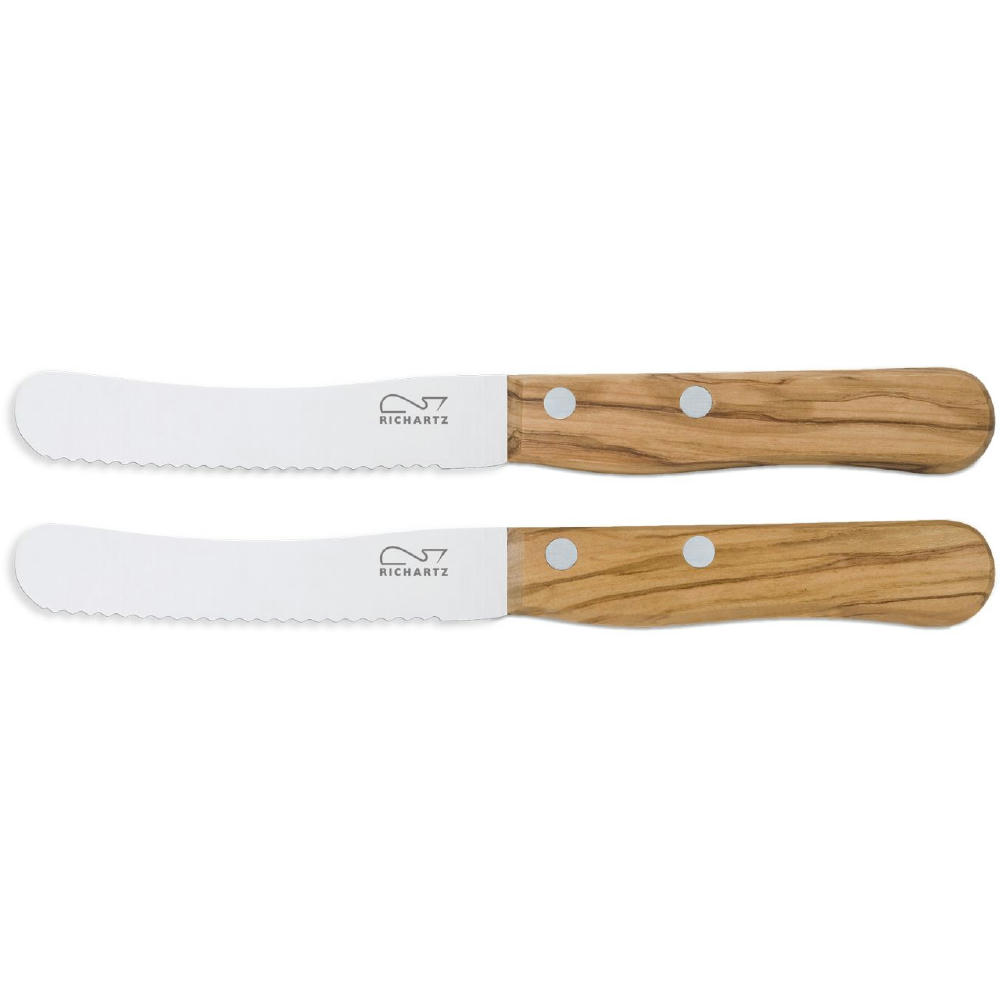 Zwei hochwertige Messer mit handgefertigten Griffen aus feinem Olivenholz – jeder Griff ist ein Unikat. Edelstahlklingen mit präzisem Wellenschliff. Ein Set, des jeden Tag Freude macht!