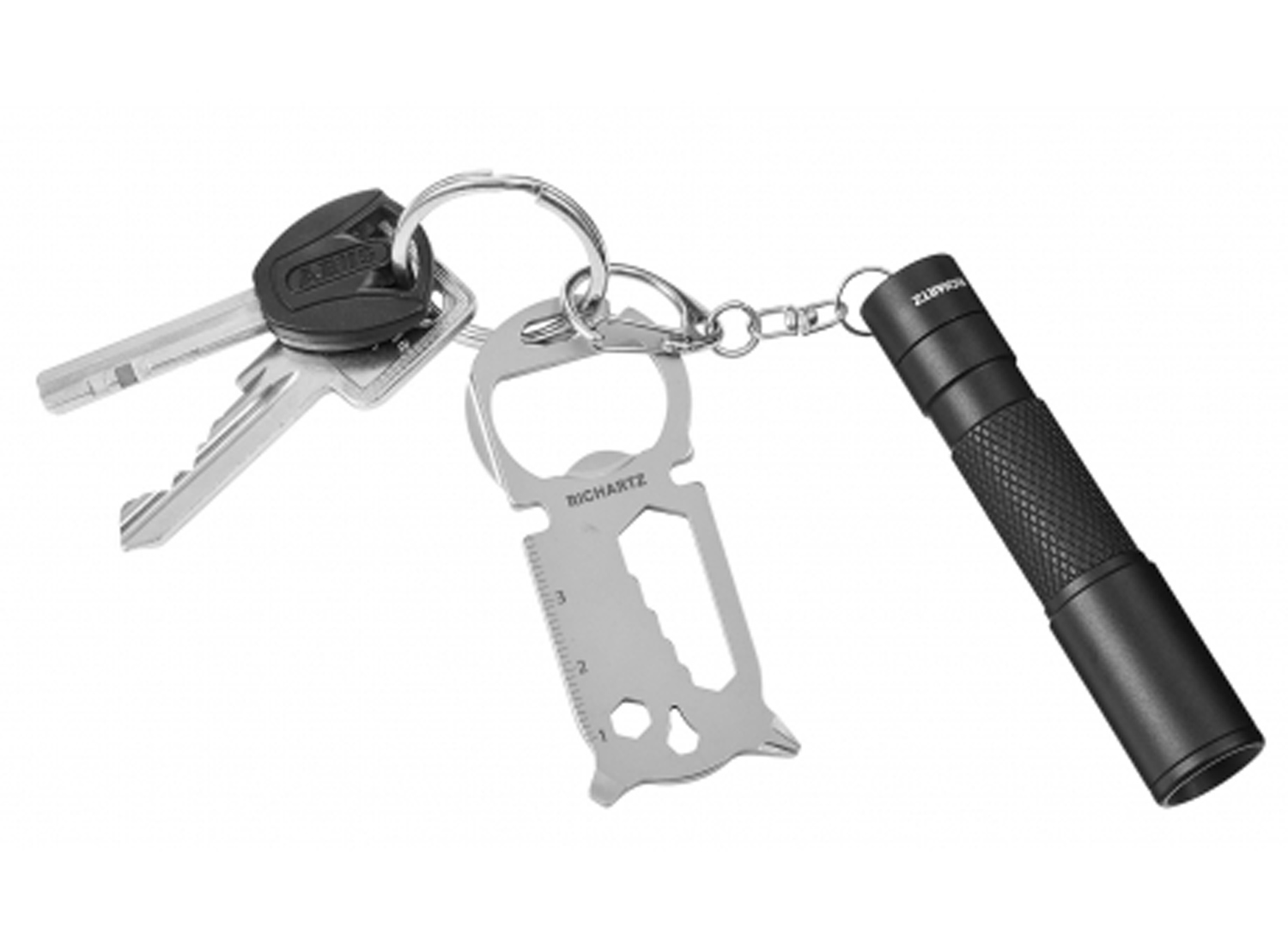 Zwei Produkte, die sich immer und überall nützlich machen: KEY TOOL 16+, das schlüsselgroße Multifunktionstool aus matt gestrahltem Edelstahl mit 16 Funktionen für den Schlüsselbund und die kompakte Taschenlampe LED LIGHT pocket aus Aluminium mit drei Leu