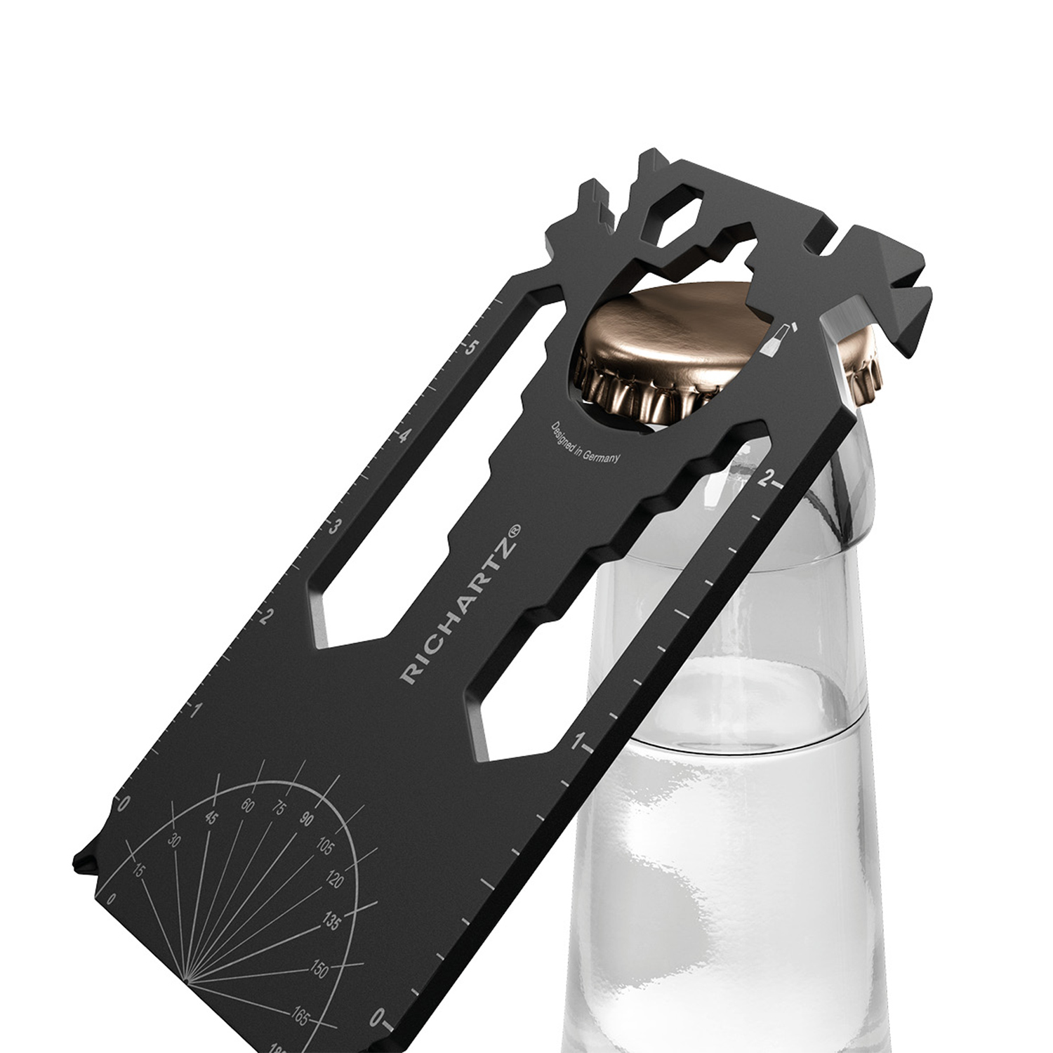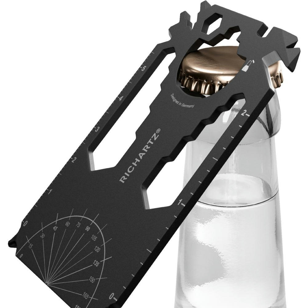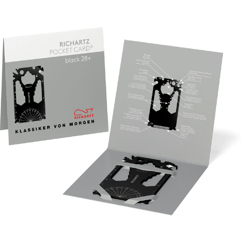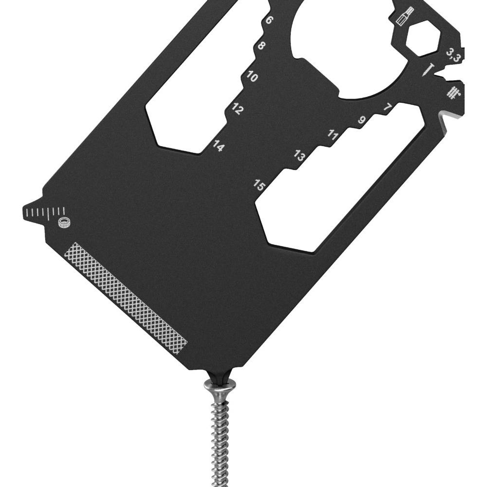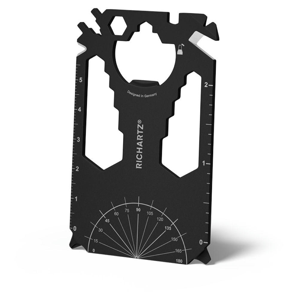 Scheckkartengroßes Multitool: Heizungsentlüftungsschlüssel, Speichenschlüssel (2), Nagelzieher, Bithalter, Stemmeisen, Brief- / Paketöffner, Kabelabisolierer, Sechskantschlüssel (12), Kapselheber, Zentimetermaß, Inchmaß, Kreuzschlitzschraubendreher, Nagelfeile, Winkelmesser, Schlitzschraubendreher, Profiltiefenmesser.
