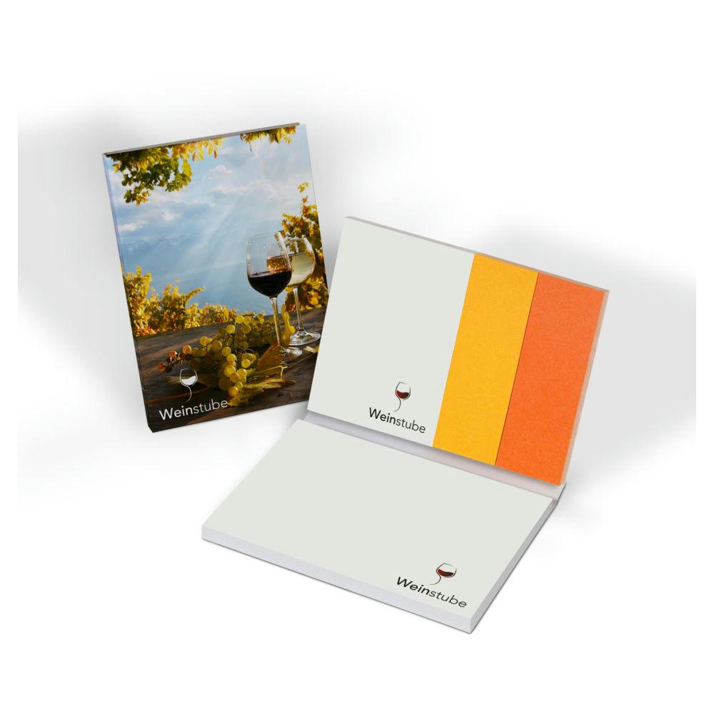 Haftset aus Recyclingpapier mit zwei Haftnotizen und zwei individuell gestaltbaren Papiermarkern. Preis inkl. 4c-Druck auf Umschlag und Haftnotizen. Material: Recyclingkarton weiß 300 g/m², powerstikkies eco (Recyclingpapier weiß, Blauer Engel®-zertifiziert), 80 g/m².