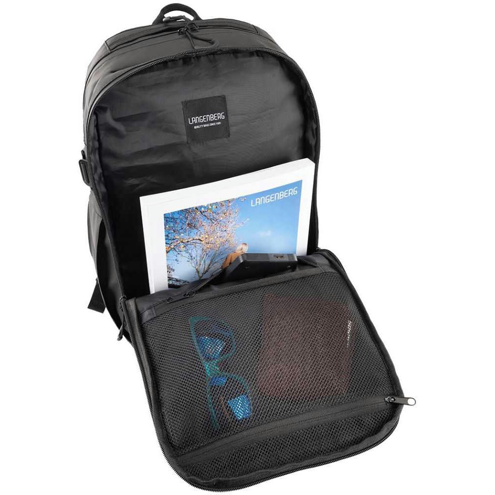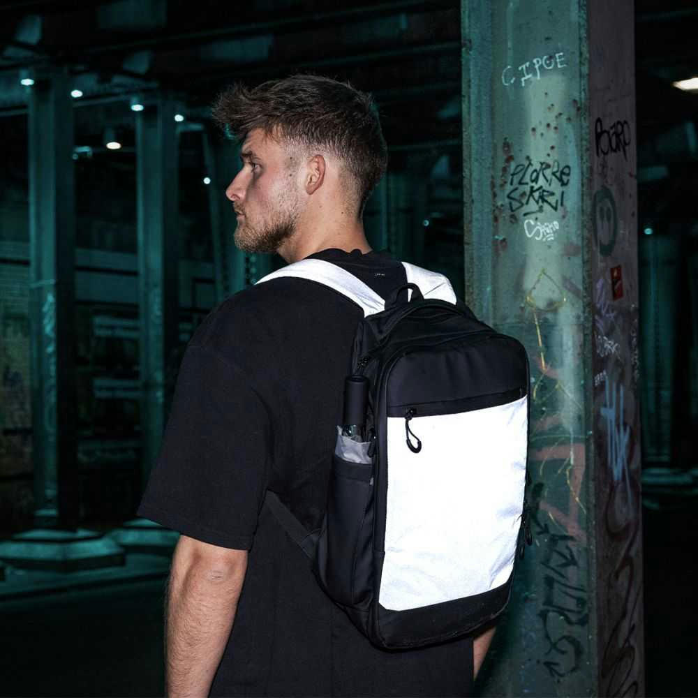 2-Wege Reißverschlusshauptfach, Gepolstertes Laptopfach bis zu 17”, 2-Wege Sekundärhauptfach mit großer Innentasche aus Mesh sowie weiterer RV-Innentasche. 2-Wege-Reißverschluss-Frontfach. Flexibele Seiten-Flaschenfächer, Trolleyschlaufe. Gepolsterte, verstellbare, reflektierende Schultergurte. Verschweißte Reißverschluss-Nähte und seitliche Verstellschnallen.