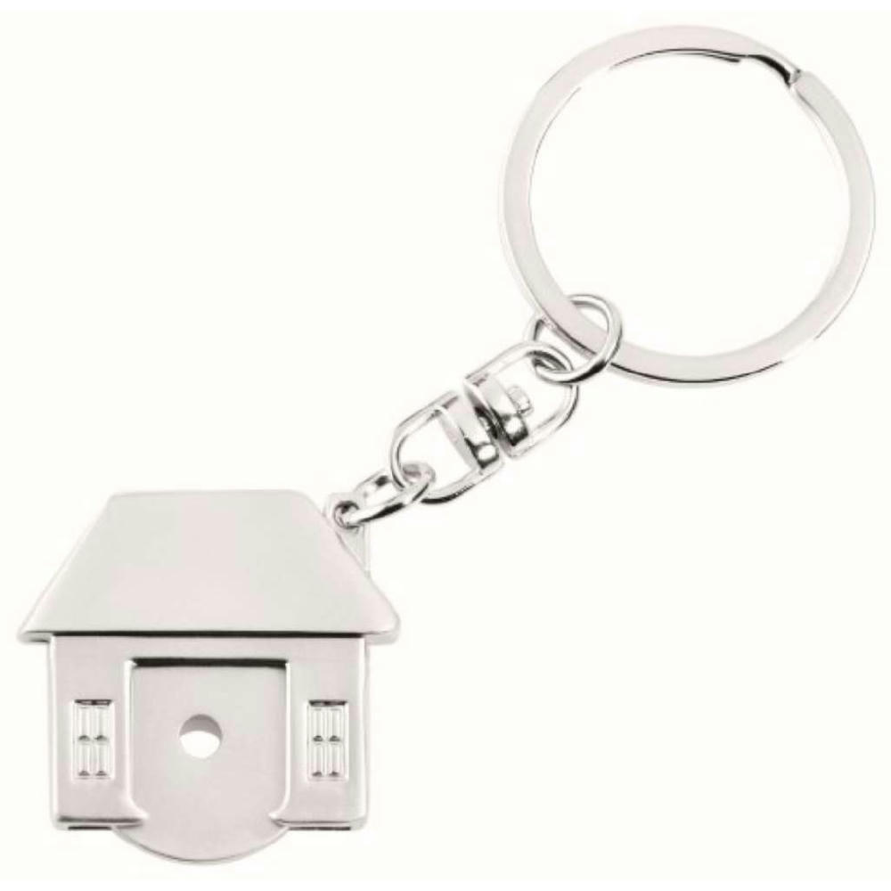 Metall-EK Chiphalter in Hausform mit Kapselheber. Auch kompatibel mit 1€ / 50 Cent Münze. Chip, 35mm Schlüsselring, Designkarton