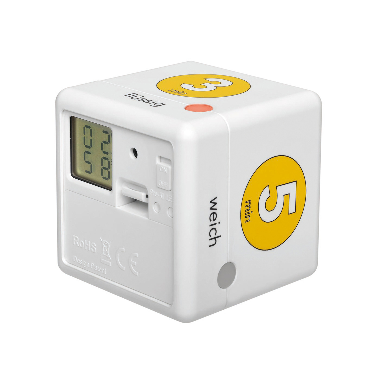 Voreingestellte Ablaufzeiten: 3 - 5 - 7 - 10 Min., gewünschte Zeit nach oben legen, Restzeitanzeige dreht sich mit, optisches & akustisches Signal nach Ablauf. Exkl. Batterien. Material: Kunststoff. Farbe: weiß. Maße: 6 x 6 x 6 cm, Gewicht: 58 g