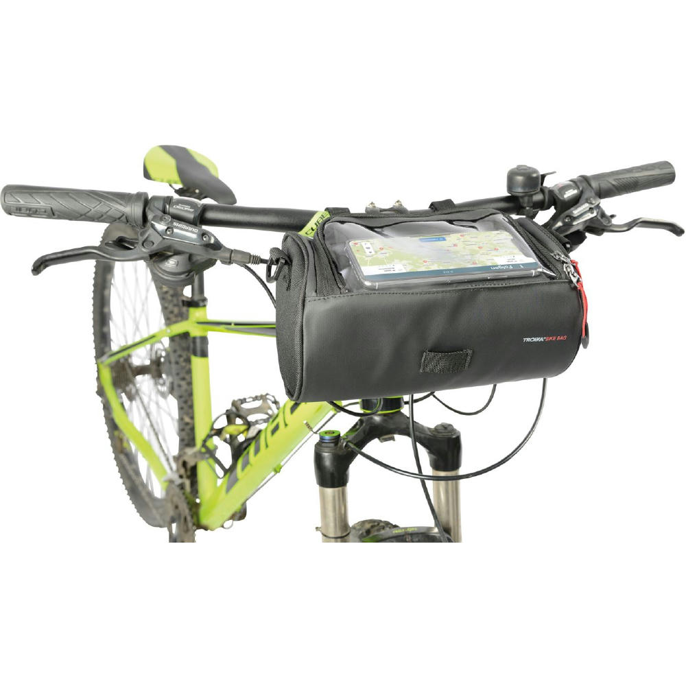 Fahrradtasche für den Lenker, flexible Befestigung mittels 3 Klettverschlussbändern am Lenker, geräumiges Hauptfach mit Reißverschluss, inkl. Netzfach (z.B.: für Powerbank), Touchscreen-Sichtfenster passend für gängige mobile Geräte zur Navigation, seitlich geöffnet zum Hauptfach (Laden via Powerbank), abnehmbarer, verstellbarer Schultergurt, Schlaufe zur Befestigung des Vorderlichts, Kapazität ca. 4 Liter, Tragkraft bis zu 5 kg, schützt Inhalt vor Spritzwasser (Wasserdichtheitsgrad IPX4) , formstabil durch verstärkte Kanten.