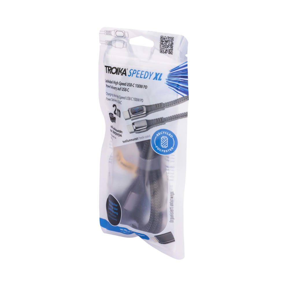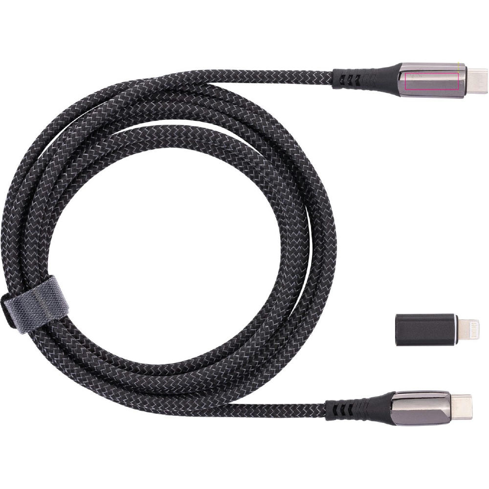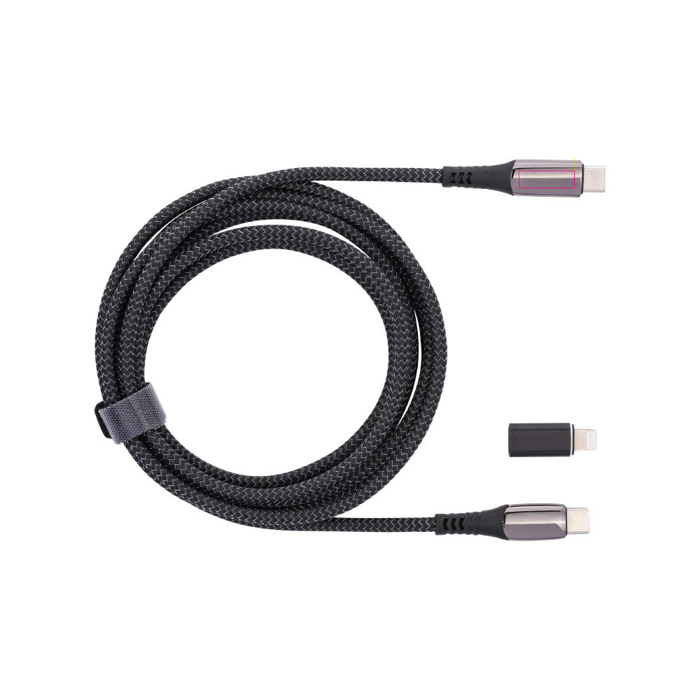 Ladekabel High-Speed USB-C 100W PD Power Delivery auf USB-C, mit Datenübertragungsfunktion, volle Ladekapazität: max. 100W|20V|5A (ohne Adapter), abhängig vom zu beladenen Gerät, mit digitaler Anzeige der Ladeleistung, inkl. USB-C auf Lightning Adapter, Kabel textilummantelt (Netzstruktur), recyceltes Polyester, 2m Länge, Metall, Polyester, gunmetal/schwarz
