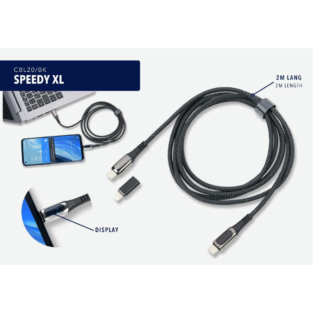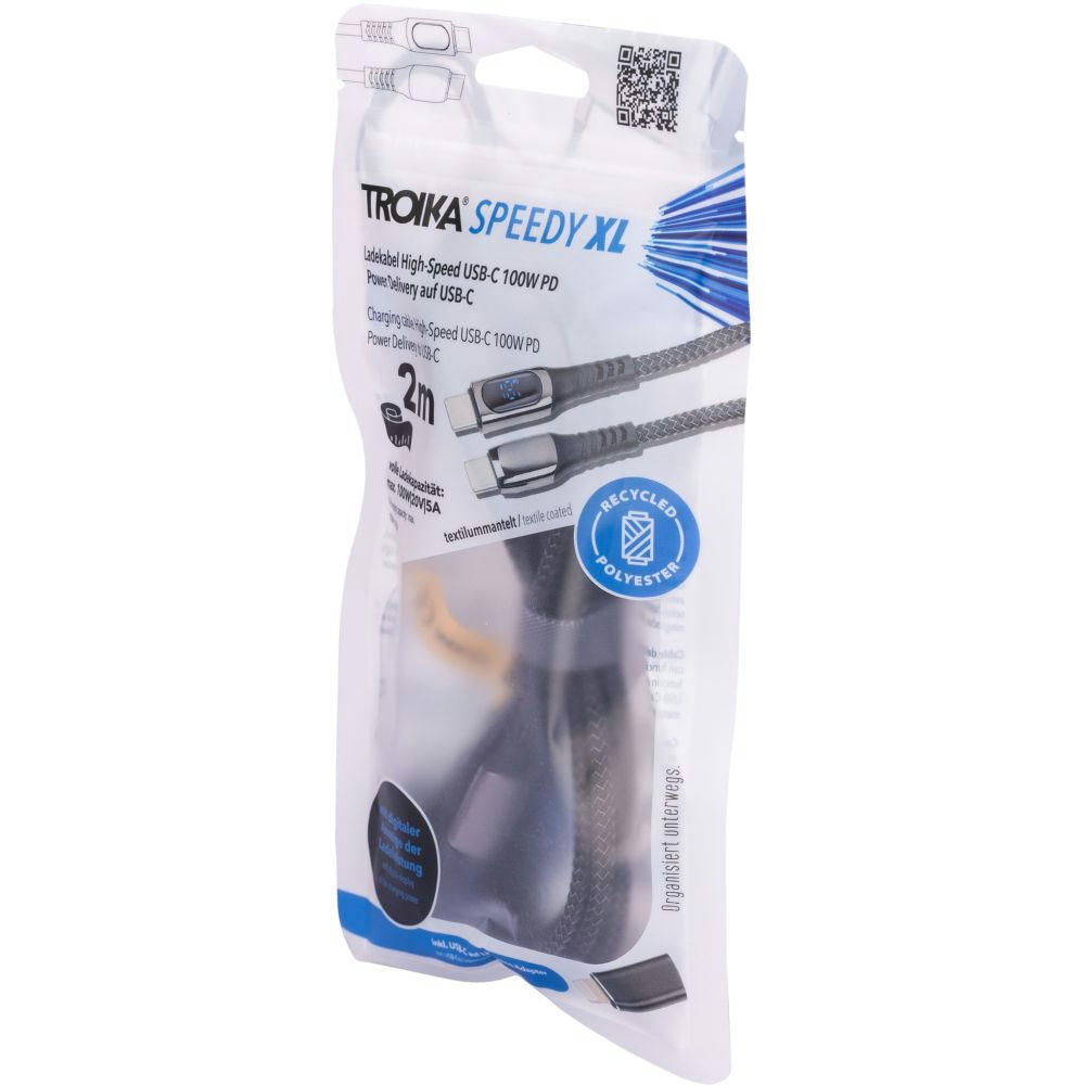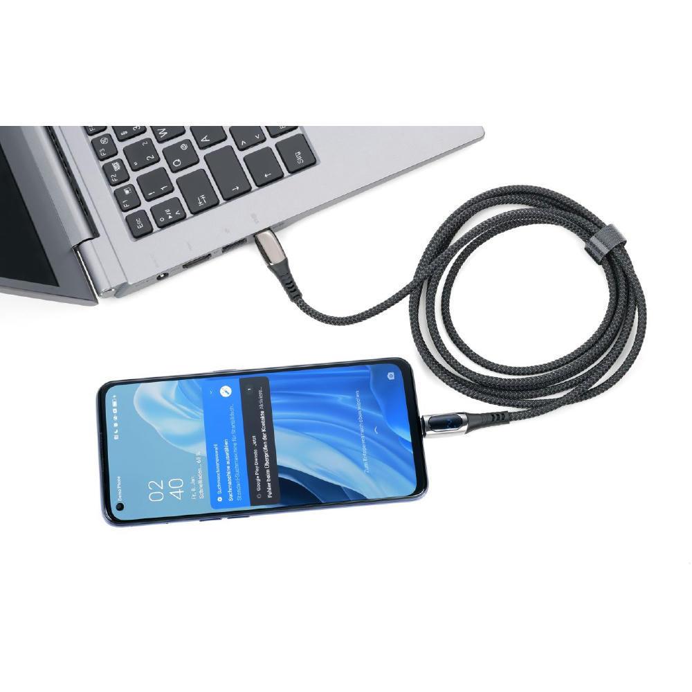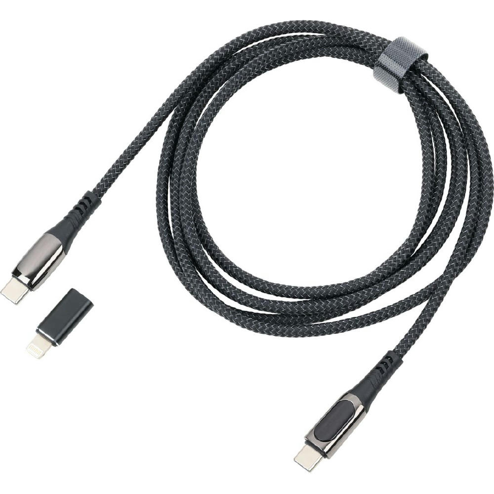Ladekabel High-Speed USB-C 100W PD Power Delivery auf USB-C, mit Datenübertragungsfunktion, volle Ladekapazität: max. 100W|20V|5A (ohne Adapter), abhängig vom zu beladenen Gerät, mit digitaler Anzeige der Ladeleistung, inkl. USB-C auf Lightning Adapter, Kabel textilummantelt (Netzstruktur), recyceltes Polyester, 2m Länge, Metall, Polyester, gunmetal/schwarz