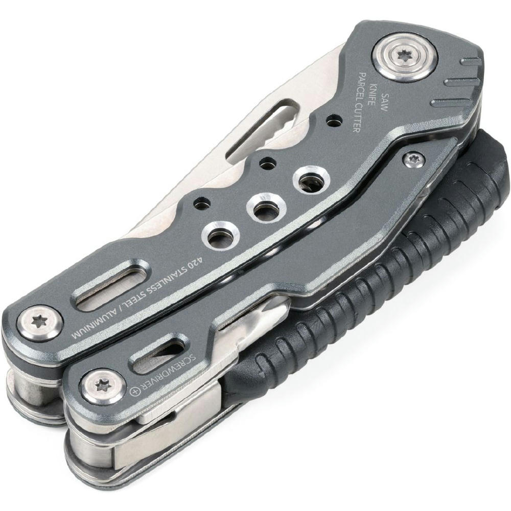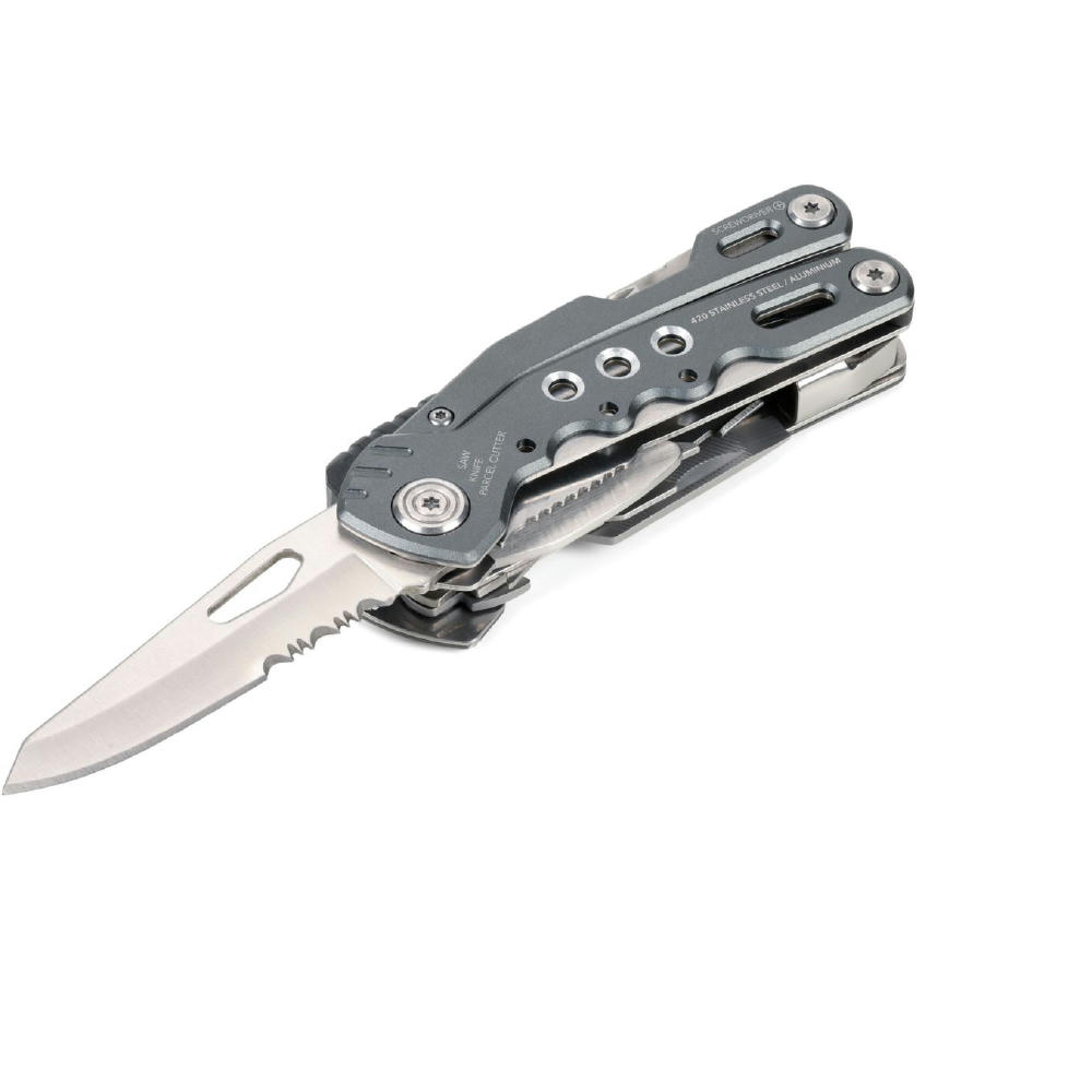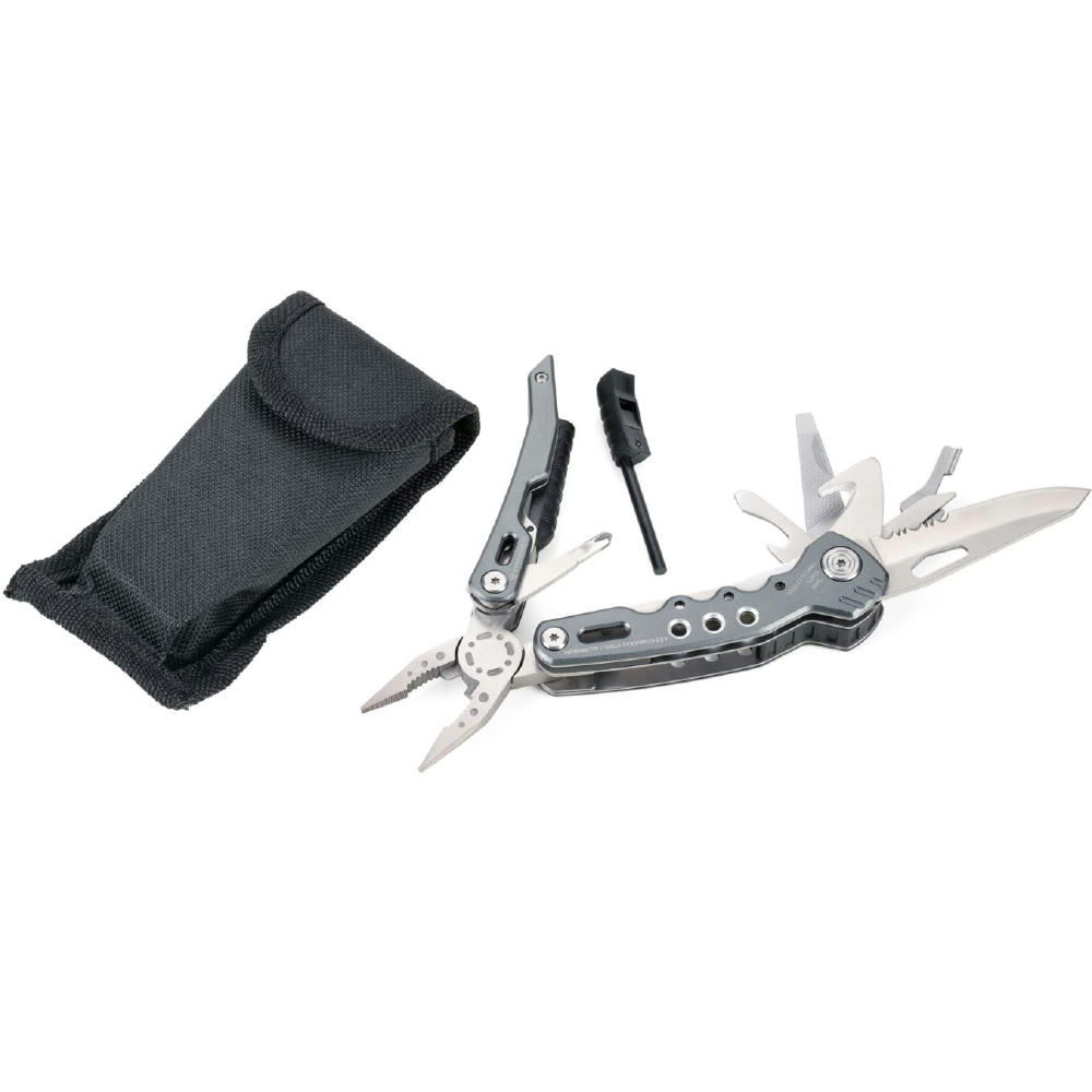 Multifunktions-Werkzeug mit 14 Funktionen, integrierte Feder und Feststellfunktion, Spitzzange, Zange, SeitenSCHNEIDER, Messer, Säge, Schere, Paketmesser, Schlitzschraubendreher in 2 Größen, Flaschenöffner, Kreuzschraubendreher, Feile, Feuerstahl, Pfeife. In Nylontasche mit Gürtelschlaufe.