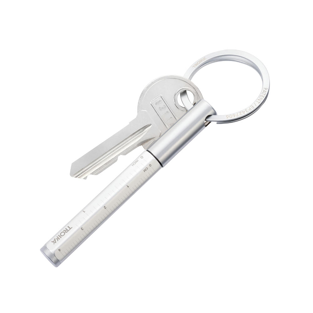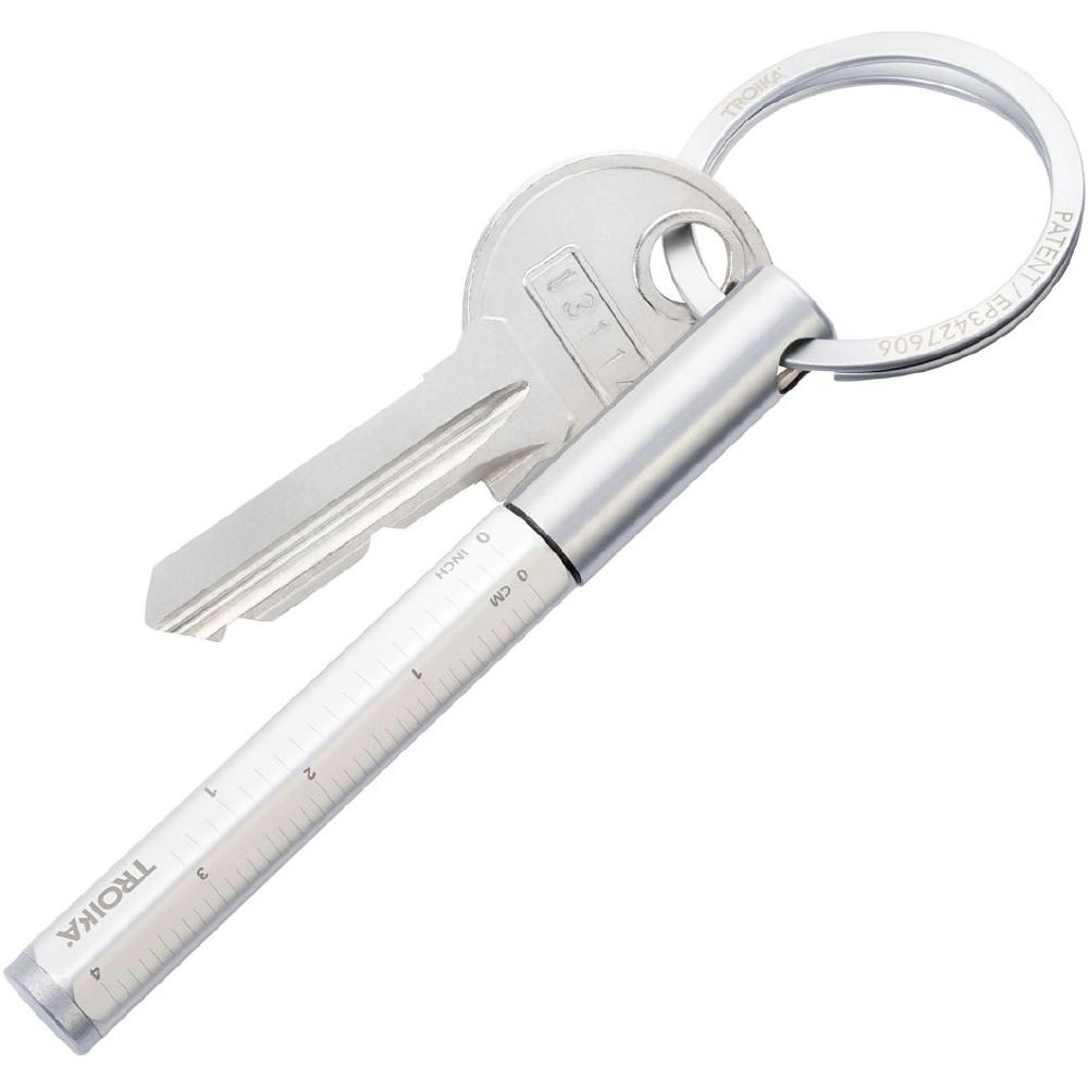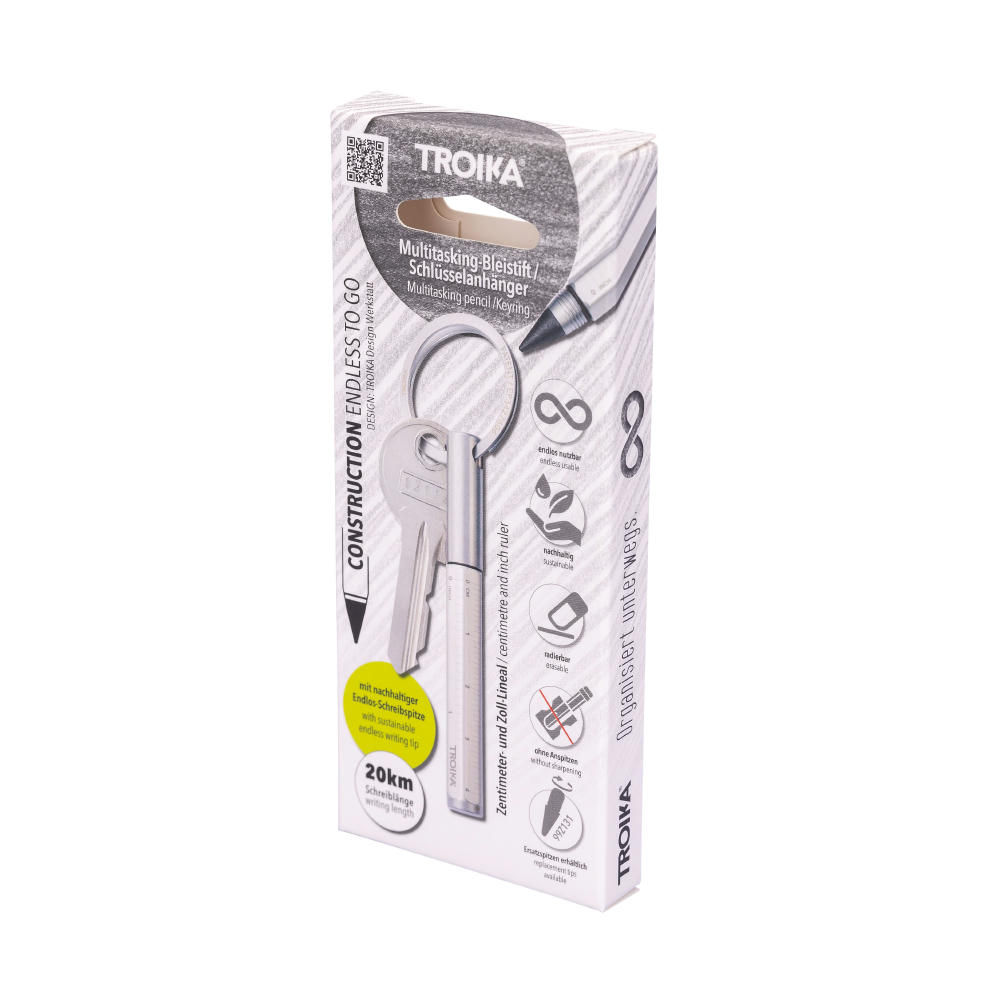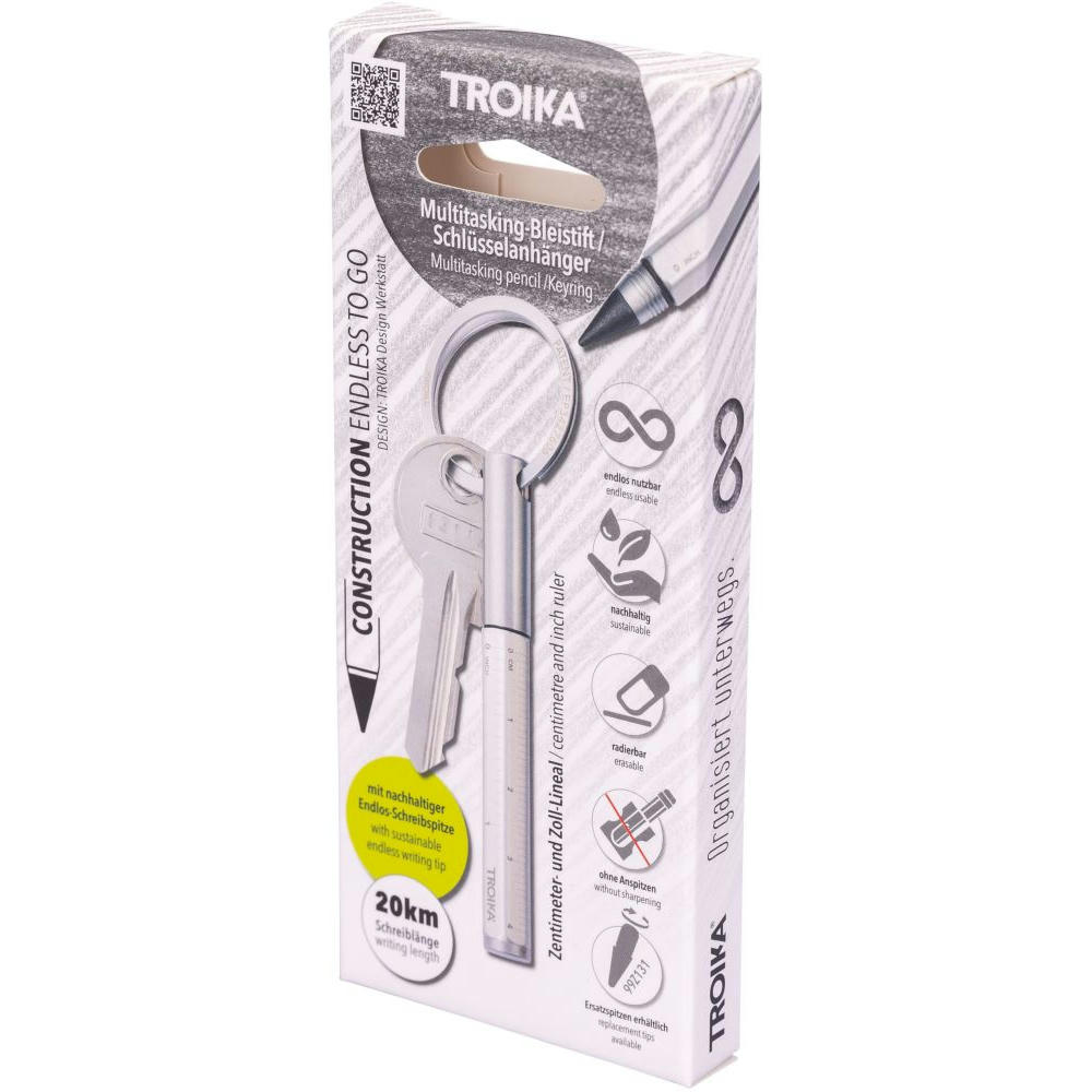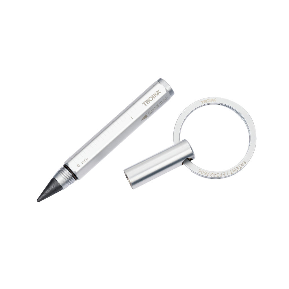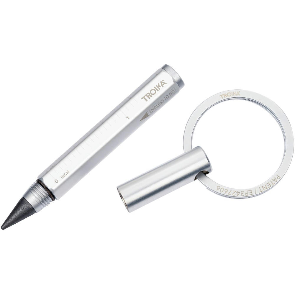 Multitasking-Bleistift und Schlüsselanhänger mit nachhaltiger Endlos-Schreibspitze (ca. 20km Schreiblänge), schnelles & einfaches Anbringen der Schlüssel dank patentiertem Öffnungsmechanismus (TROIKA NAIL GUARD), Zentimeter-/Zoll-Lineal, HB, radierbar, ohne Anspitzen, Schreibspitze austauschbar, Aluminium, matt, silberfarben