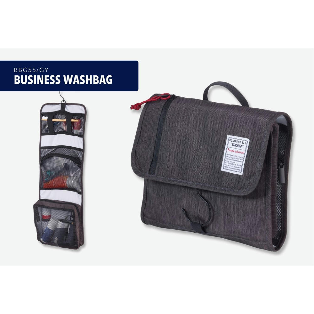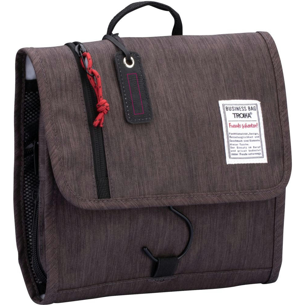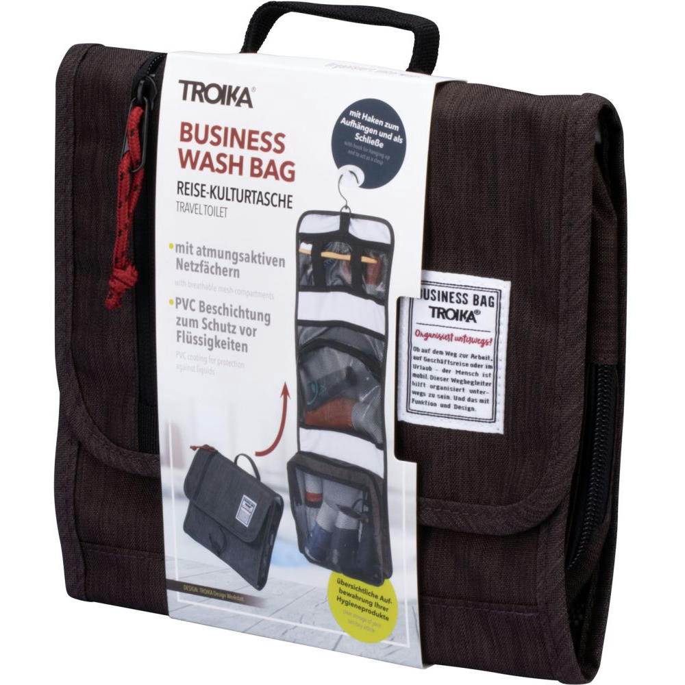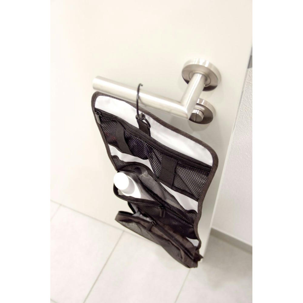 Reise-Kulturtasche mit Haken zum Aufhängen und als Schließe, Innen: atmungsaktives Netzfach mit Reißverschluss und Steckfächern, 2 Reißverschlussfächer mit Netz und PVC Beschichtung (Schutz vor Flüssigkeiten), Fronttasche mit Reißverschluss