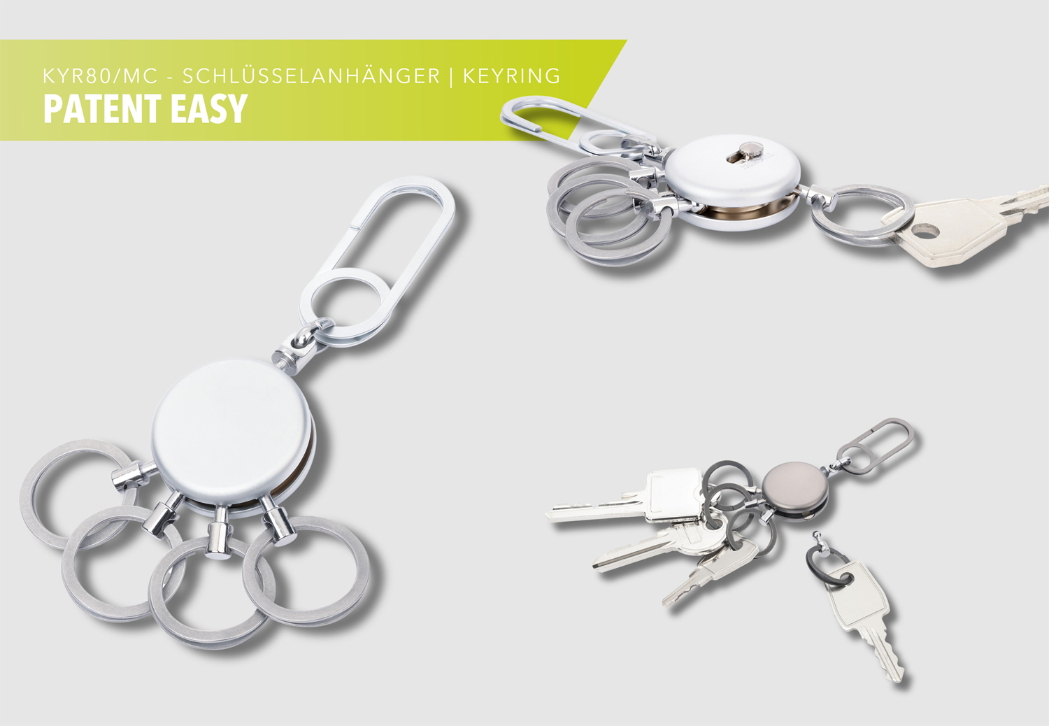 Schlüsselanhänger, rund, inkl. Karabinerhaken, 4 ausklinkbare Ringe, schnelles & einfaches Anbringen der Schlüssel dank patentiertem Öffnungsmechanismus (Nail Guard), Messing, Metall, verchromt, matt, gunmetal.