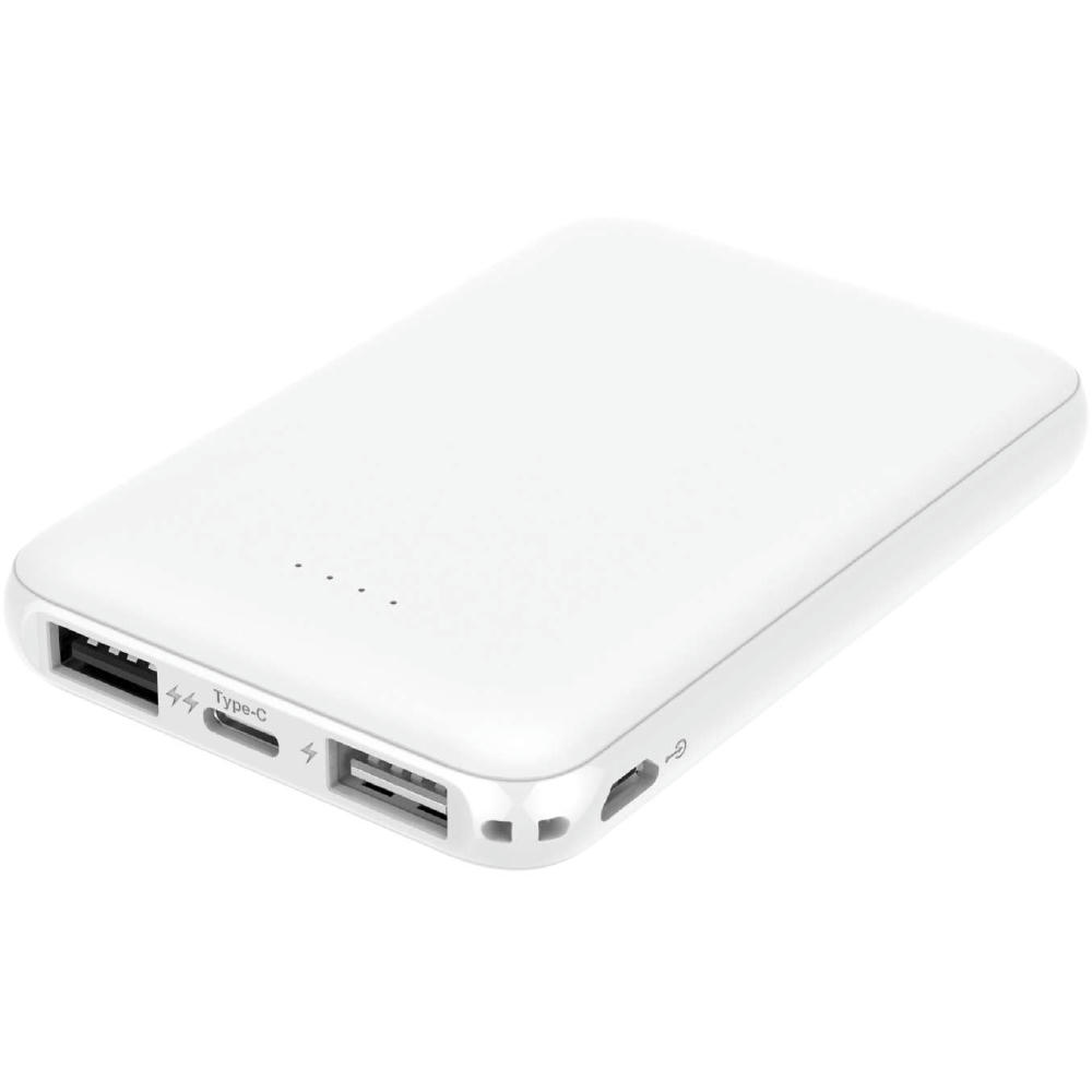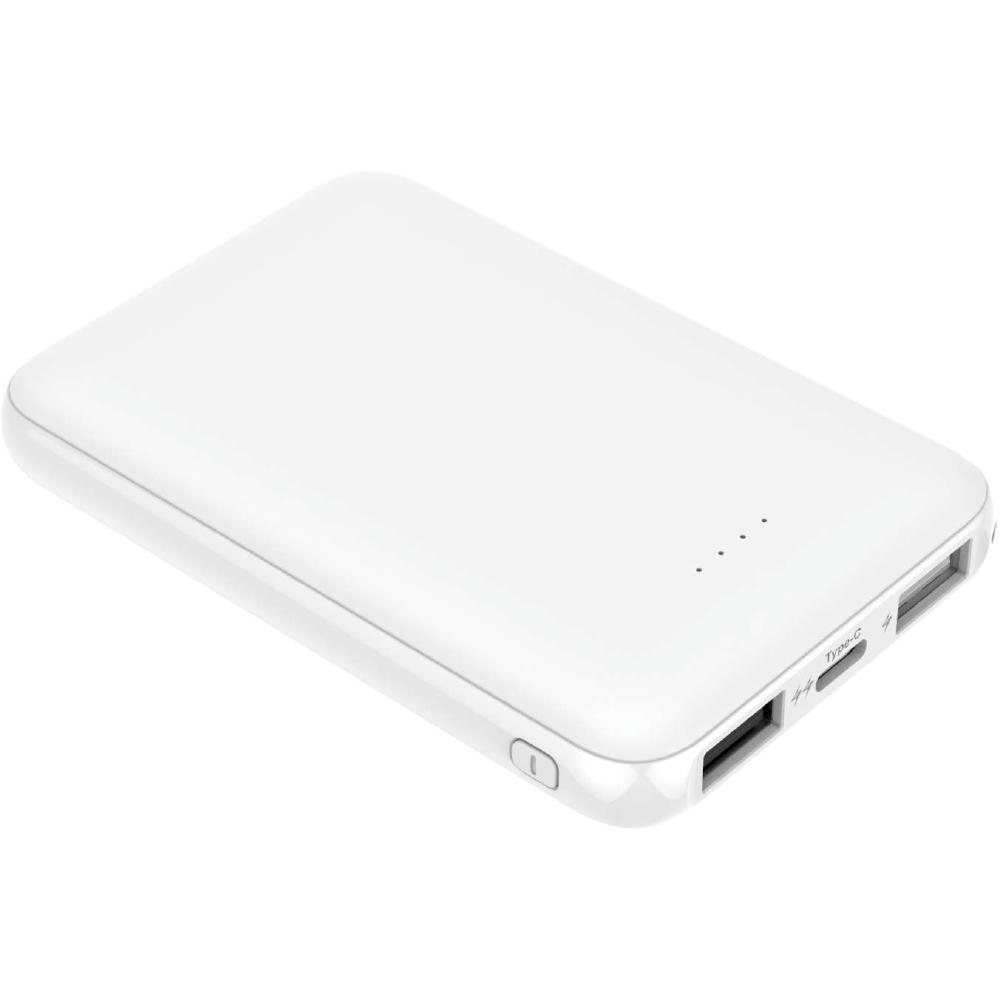 Handliche Powerbank in edlem Weiß. - Mit vierstufiger LED- Ladestandanzeige auf der Vorderseite. - Kapazität: 5000mAh - Input Micro-USB und USB-C: DC 5V/2.1A (max.) - Output USB-C: DC 5V/2.1A - Output USB-A1: DC 5V/1A - Output USB-A2: DC 5V/2.1A - Output kombiniert: DC 5V/2.1A (max.) - Inklusive 25 cm USB-A auf USB-C Kabel - Material: ABS - Plastikfreie Einzelverpackung - Maße: 95,5 x 63,5 x 14,5 mm - Gewicht ohne Verpackung: 119 g - - - - - Werbeanbringung: - Auf der Körperoberseite 40 x 50 mm (D2, UV2, GP2) - Auf der Körperunterseite 40 x 40 mm (D2, UV2, GP2) - - Dieses Produkt unterstützt aktiv den Ausgleich der entstehenden CO2-Emissionen durch zertifizierte Klimaschutzprojekte.