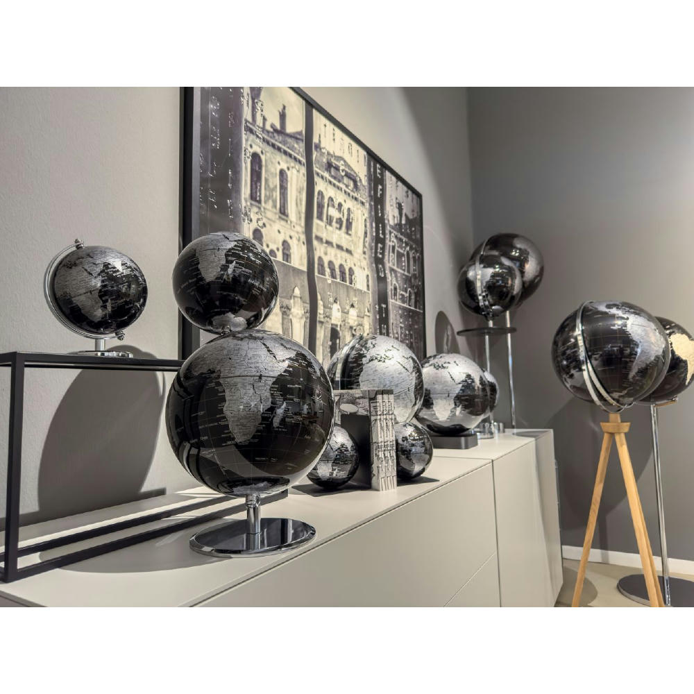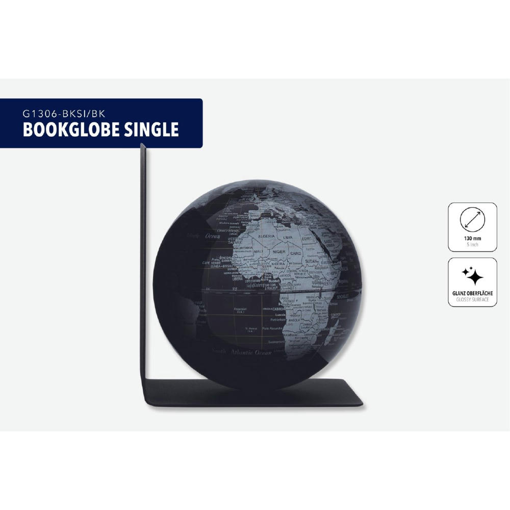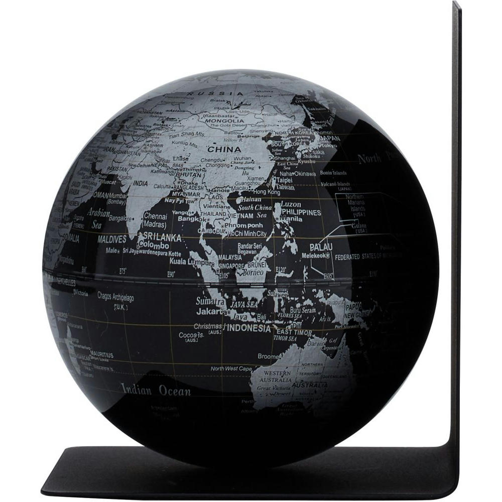 Globus mit Buchstütze aus Metall, magnetischer Globus mit 13 cm Durchmesser, Kunststoff, Metall, matt, schwarz/silberfarben.