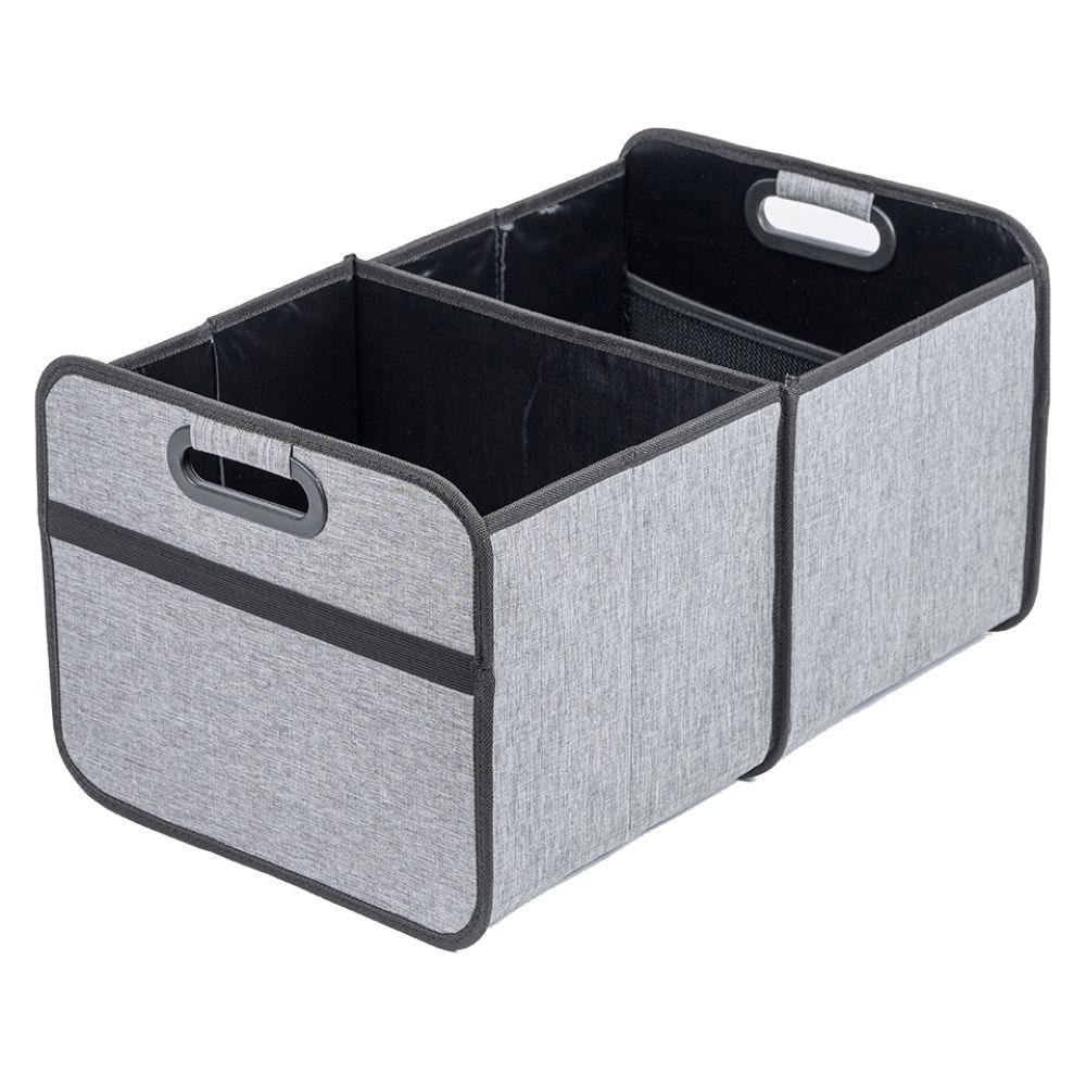 Der zusammenfaltbare Organizer mit 2 integrierten Tragegriffen aus Kunststoff bietet viel Platz zum Verstauen von Einkäufen, Spielzeug, Sportartikel, Autozubehör, Büromaterial und vielem mehr. Die Faltbox beinhaltet zwei Fächer mit je einem Netzeinsteckfach mit Gummiband und ist durch den verstärkten Einlegeboden äußerst robust und gut geeignet für schweren Inhalt.